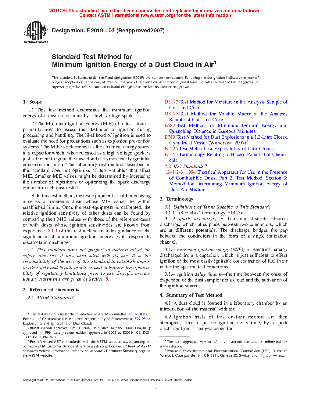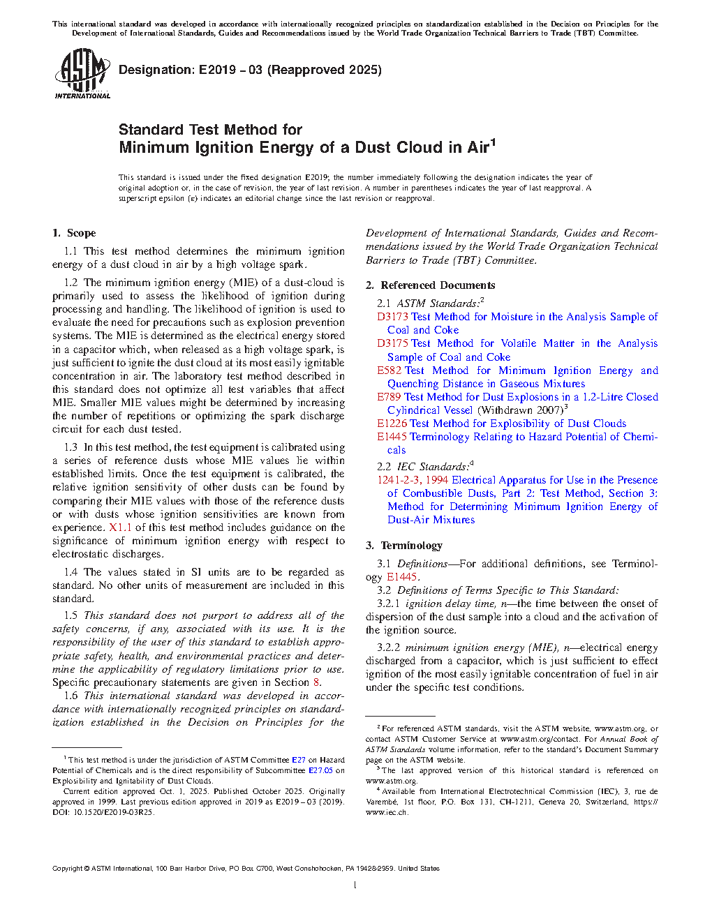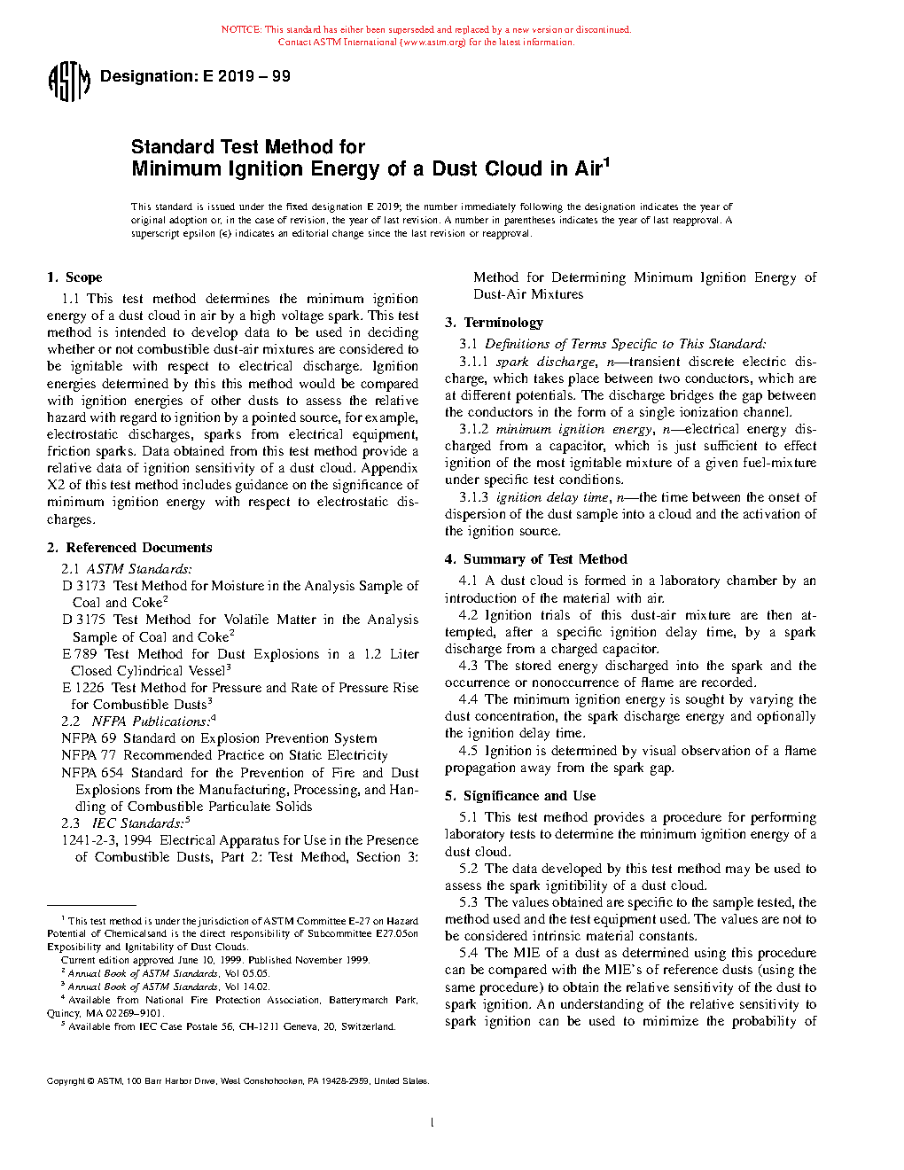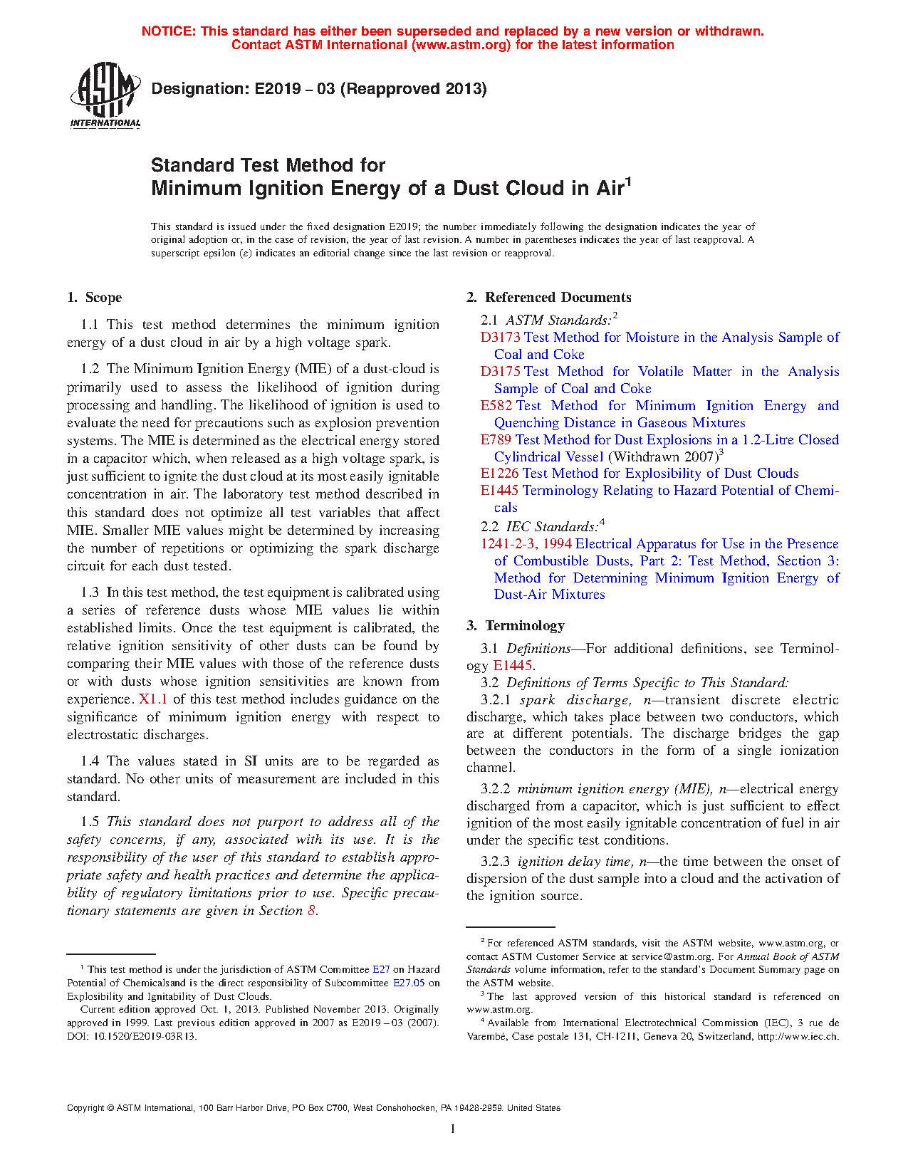1.3 In this test method, the test equipment is calibrated using a series of reference dusts whose MIE values lie within established limits. Once the test equipment is calibrated, the relative ignition sensitivity of other dusts can be found by comparing their MIE values with those of the reference dusts or with dusts whose ignition sensitivities are known from experience. X1.1 of this test method includes guidance on the significance of minimum ignition energy with respect to electrostatic discharges.