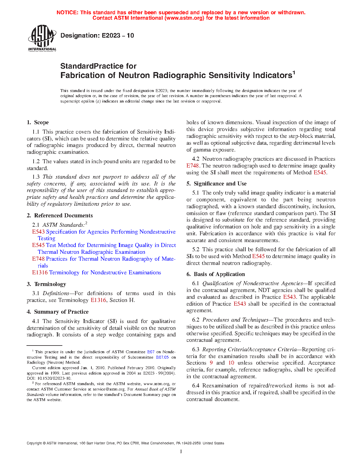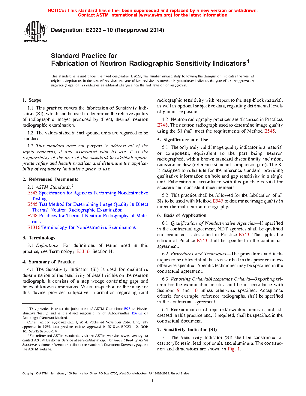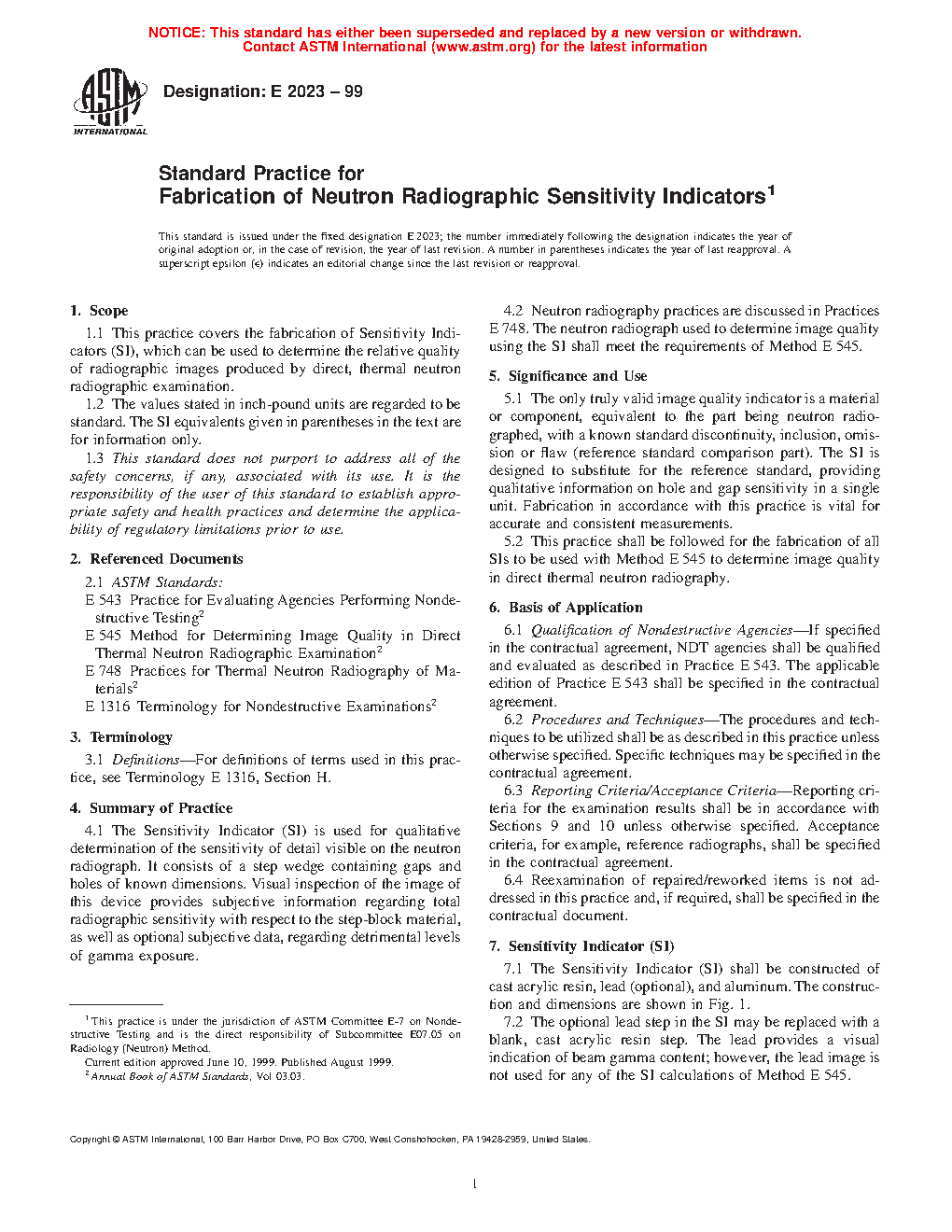 5.2 This practice shall be followed for the fabrication of all SIs to be used with Test Method E545 to determine image quality in direct thermal neutron radiography. Devices constructed to previous versions of this practice, or Test Method E545 for devices built between 1981 and 1991, can also be used.