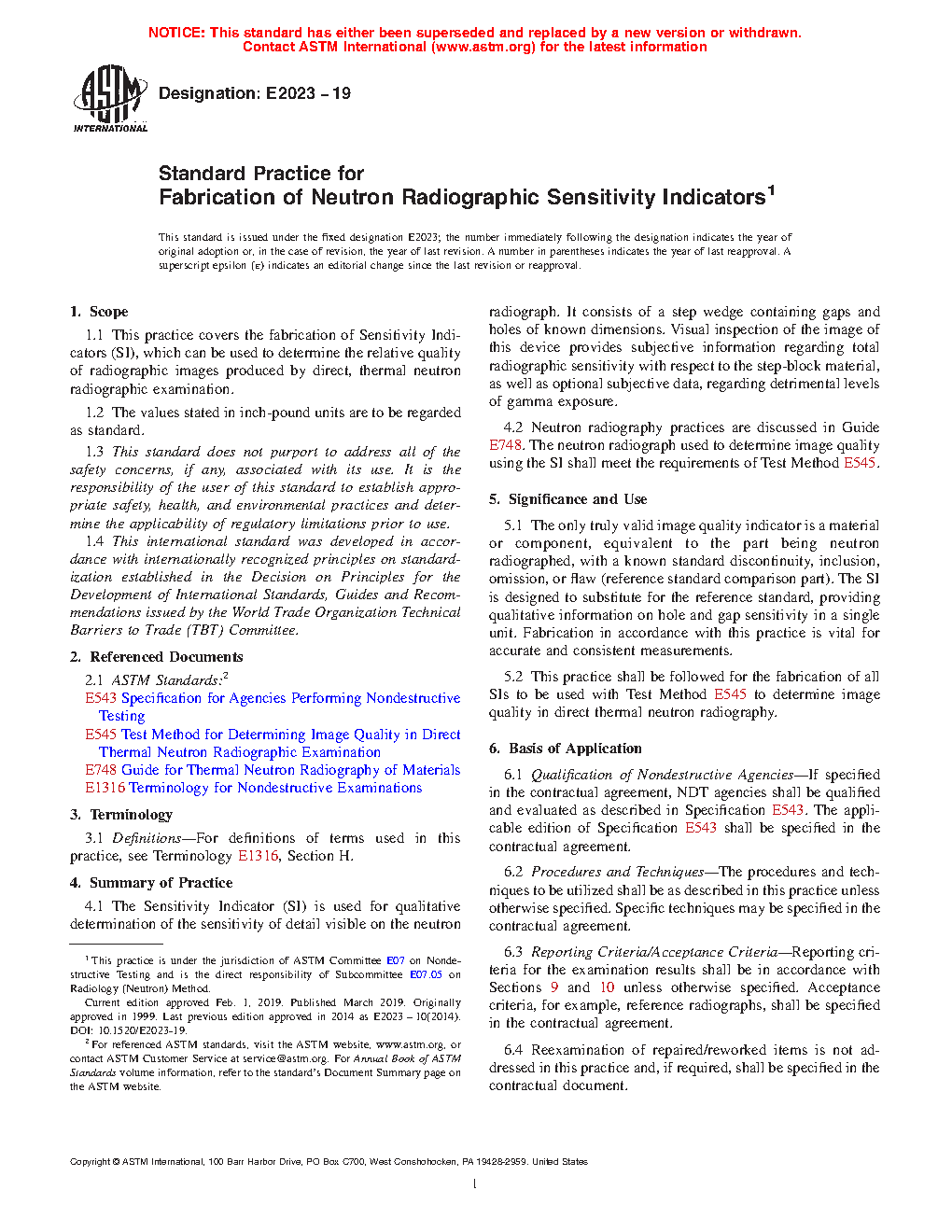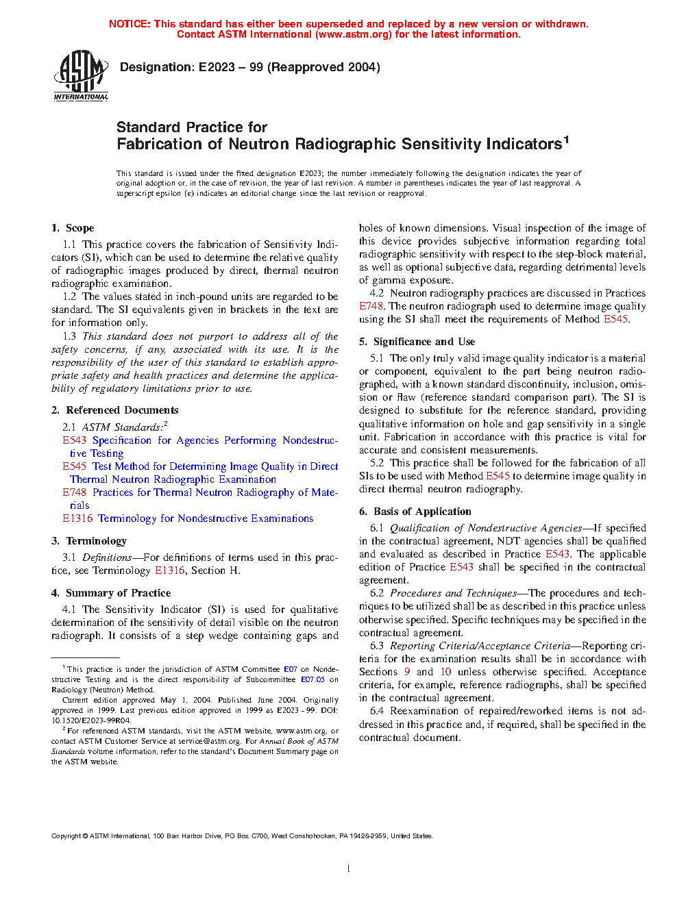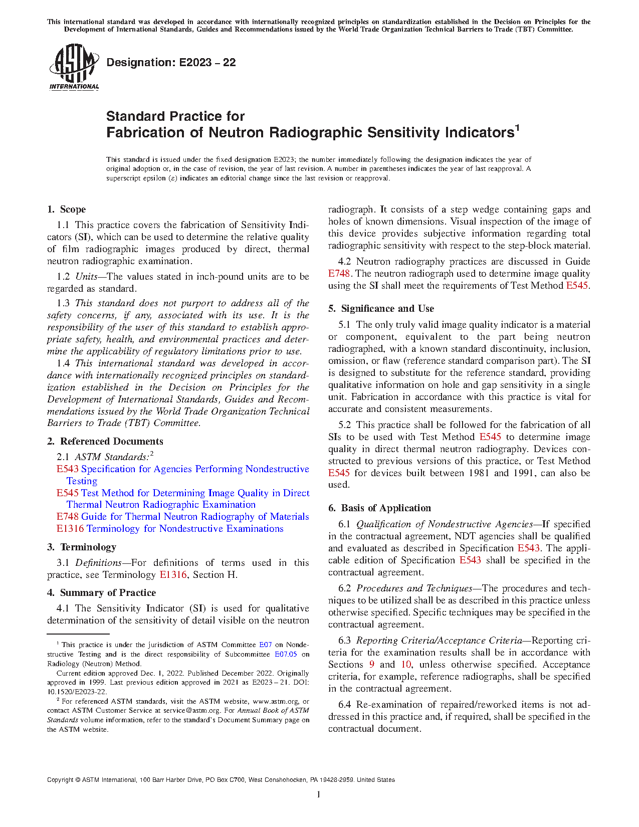 5.2 This practice shall be followed for the fabrication of all SIs to be used with Test Method E545 to determine image quality in direct thermal neutron radiography. Devices constructed to previous versions of this practice, or Test Method E545 for devices built between 1981 and 1991, can also be used.