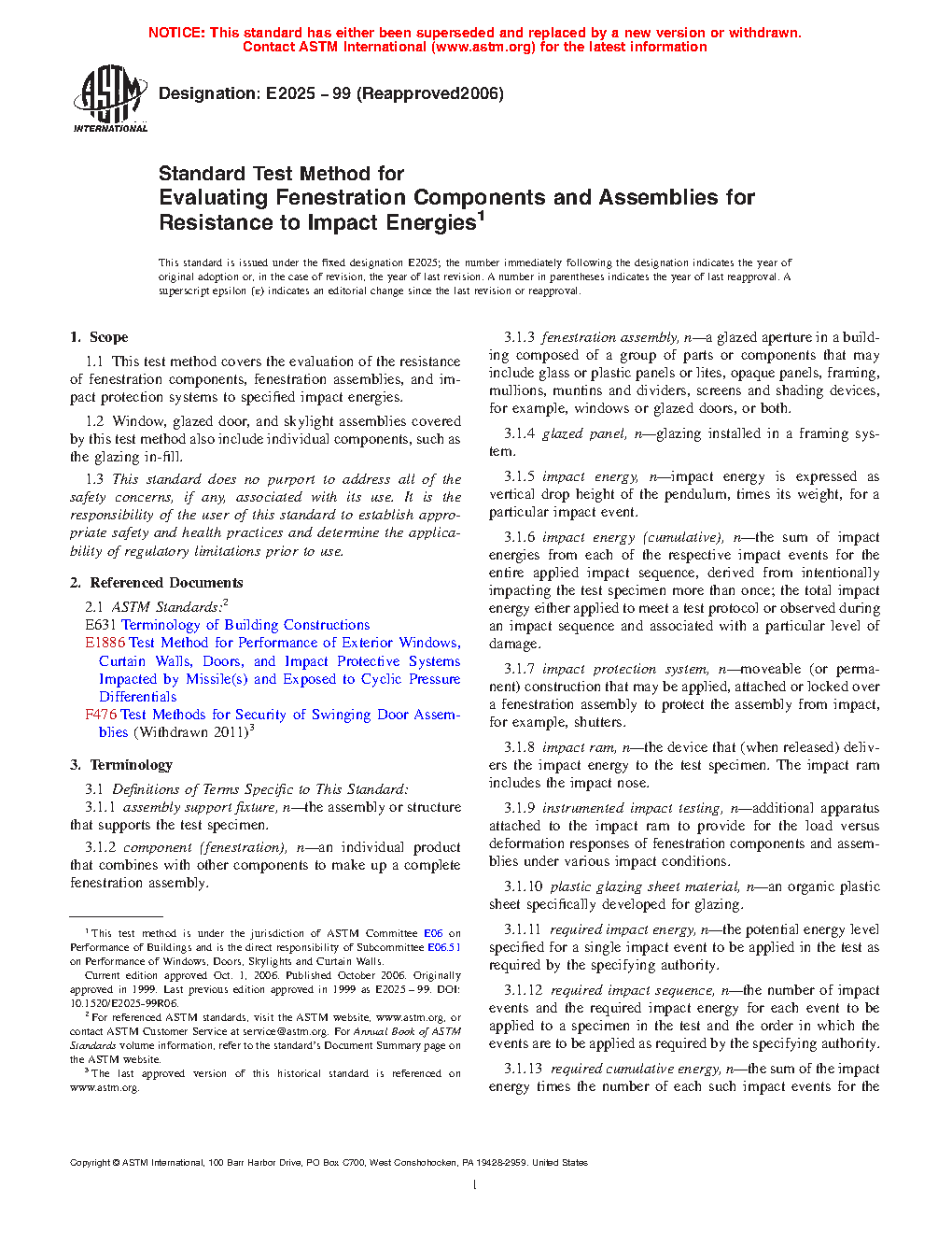 This test method is intended for determining the ability of a fenestration component, fenestration assembly, or impact protection system to resist specified impact energies.