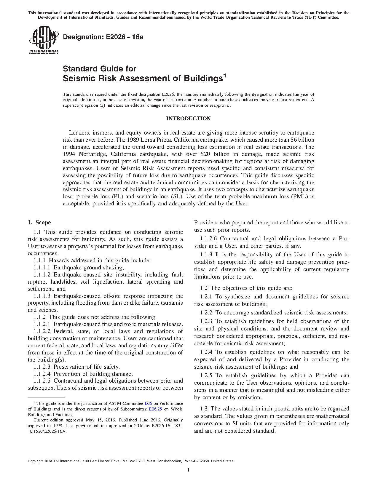 1.1 Purpose-This guide defines and establishes good commercial, customary practice, and standard-of-care in the United States for conducting a probabilistic study of expected loss to buildings from damage associated with earthquakes and for the preparation of a narrative report containing the results of the study. As such, this guide permits a user to satisfy, in part, their real estate transactional due-diligence requirements with respect to assessing a property's potential for building losses associated with earthquakes.
