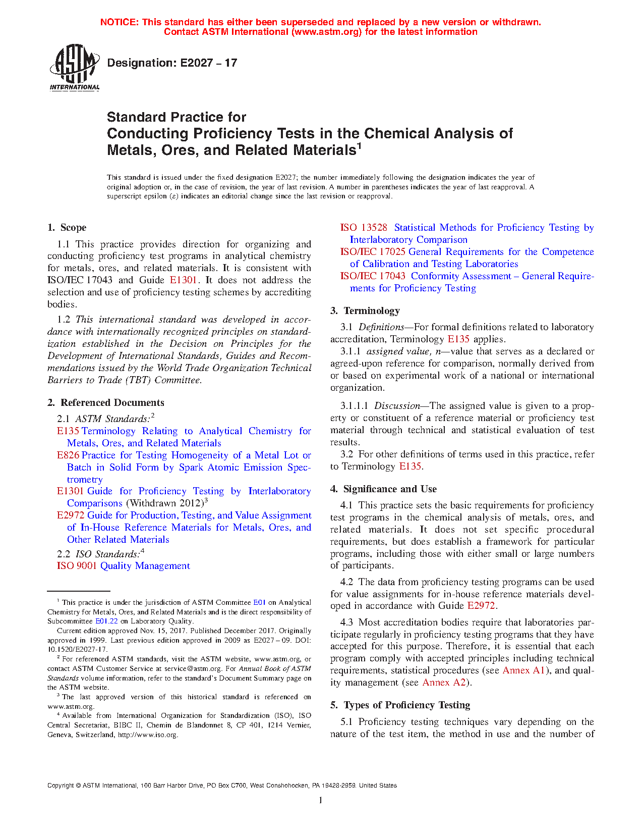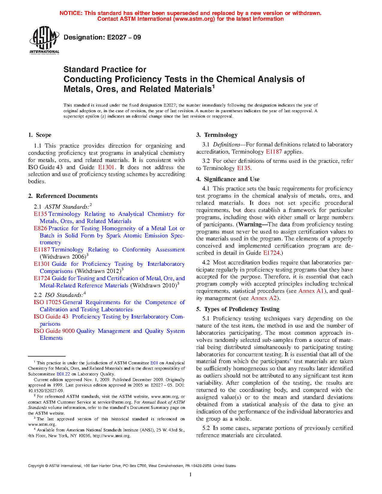 1.1 This practice provides direction for organizing and conducting proficiency test programs in analytical chemistry for metals, ores, and related materials. It is consistent with ISO/IEC 17043 and Guide E1301. It does not address the selection and use of proficiency testing schemes by accrediting bodies.