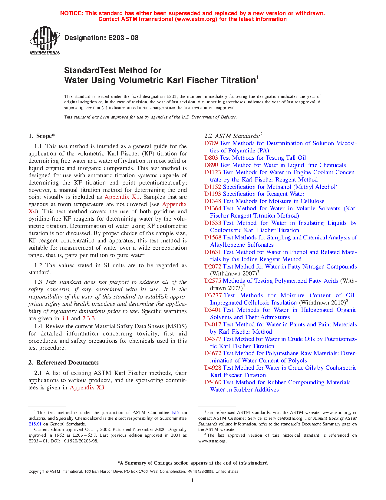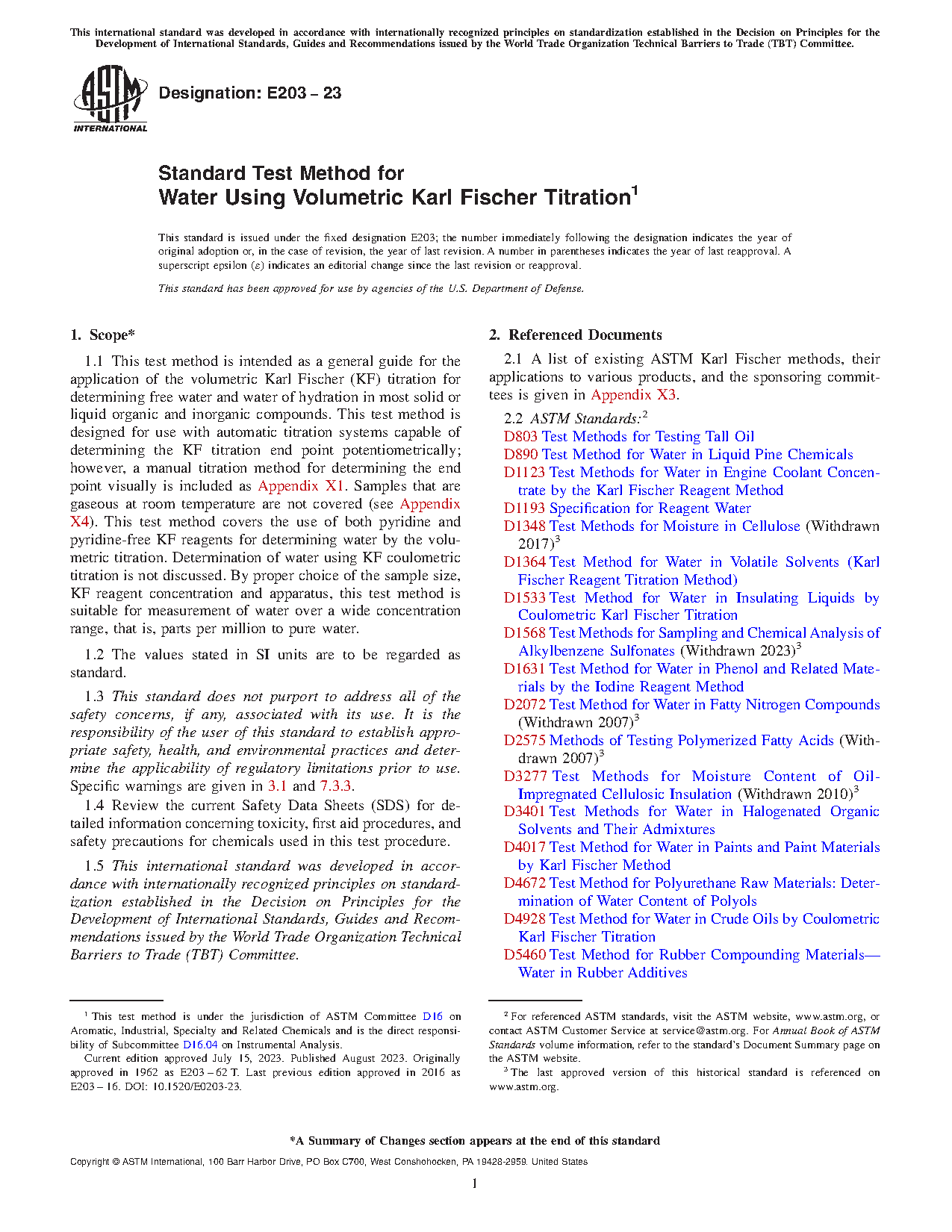 1.1 This test method is intended as a general guide for the application of the volumetric Karl Fischer (KF) titration for determining free water and water of hydration in most solid or liquid organic and inorganic compounds. This test method is designed for use with automatic titration systems capable of determining the KF titration end point amperometrically; however, a manual titration method for determining the end point visually is included as Appendix X1 . Samples that are gaseous at room temperature are not covered (see Appendix X4). This test method covers the use of both pyridine and pyridine-free KF reagents for determining water by the volumetric titration. Determination of water using KF coulometric titration is not discussed. By proper choice of the sample size, KF reagent concentration and apparatus, this test method is suitable for measurement of water over a wide concentration range, that is, parts per million to pure water.