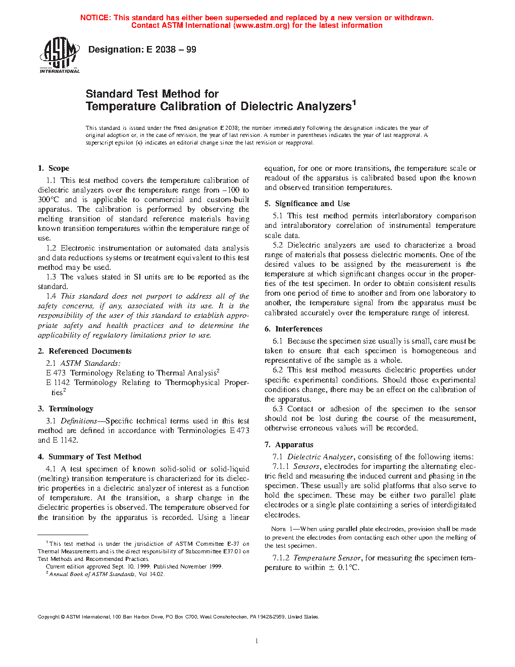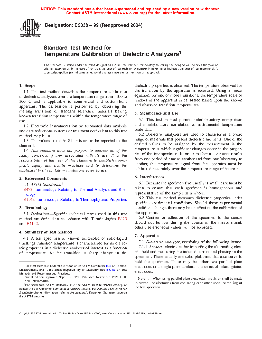 1.1 This test method covers the temperature calibration of dielectric analyzers over the temperature range from -100 to 300°C and is applicable to commercial and custom-built apparatus. The calibration is performed by observing the melting transition of standard reference materials having known transition temperatures within the temperature range of use.