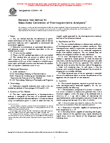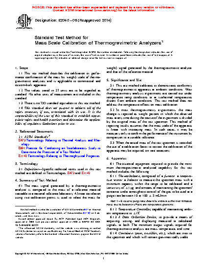 1.1 This test method describes the calibration or performance confirmation of the mass (or weight) scale of thermogravimetric analyzers and is applicable to commercial and custom-built apparatus.