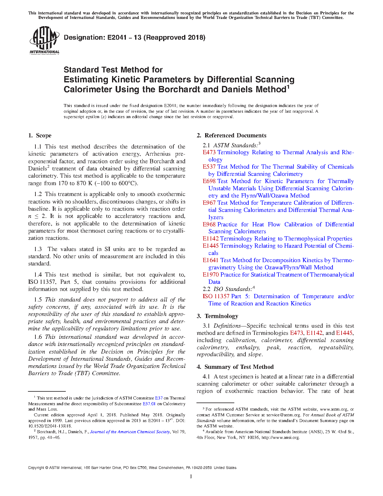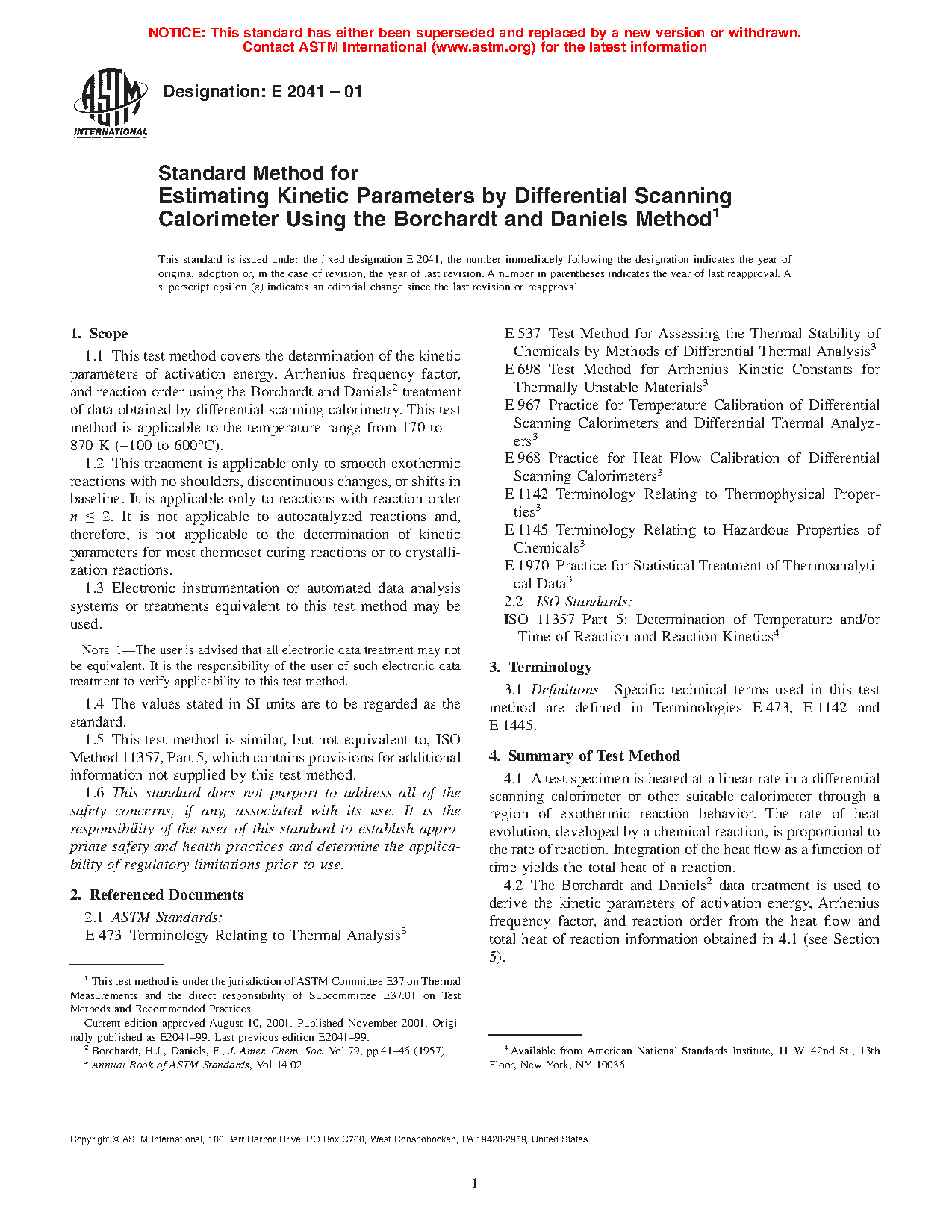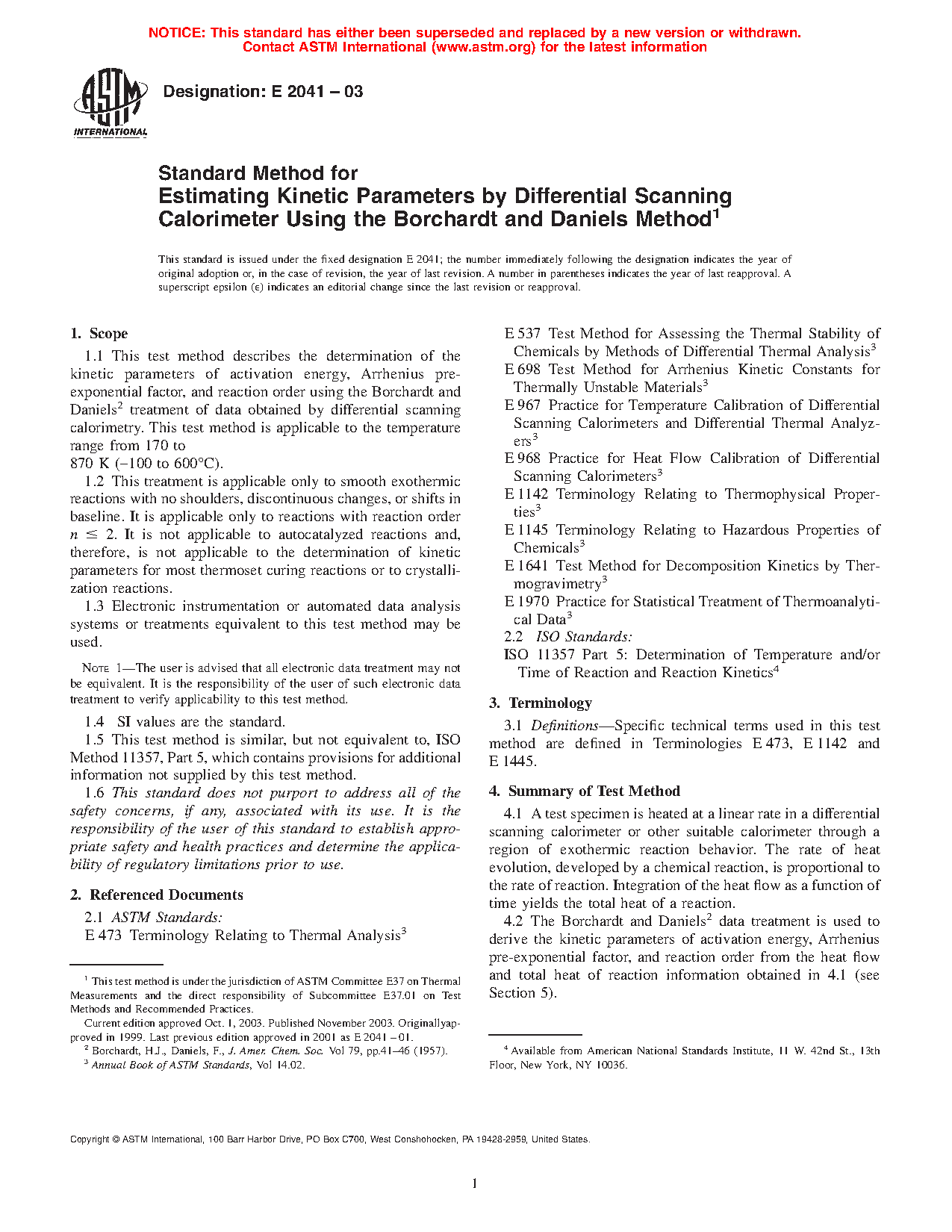 1.1 This test method describes the determination of the kinetic parameters of activation energy, Arrhenius pre-exponential factor, and reaction order using the Borchardt and Daniels2 treatment of data obtained by differential scanning calorimetry. This test method is applicable to the temperature range from 170 K to 870 K (-100 °C to 600°C).