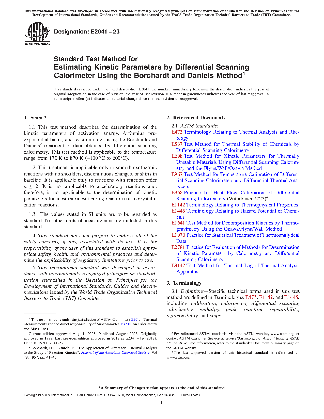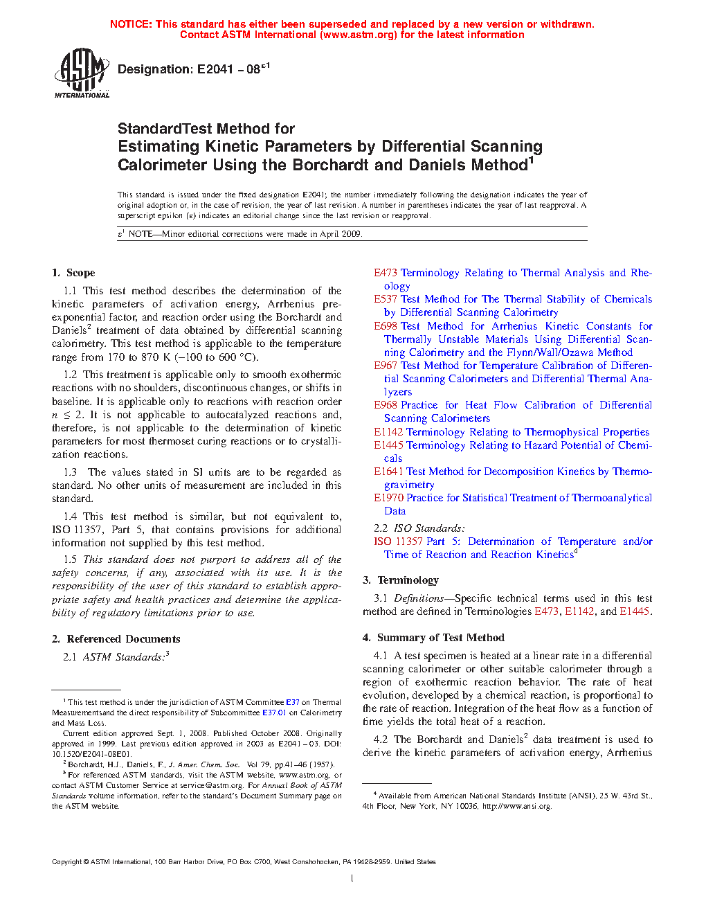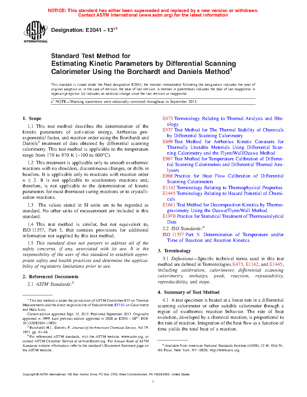 1.1 This test method describes the determination of the kinetic parameters of activation energy, Arrhenius pre-exponential factor, and reaction order using the Borchardt and Daniels2 treatment of data obtained by differential scanning calorimetry. This test method is applicable to the temperature range from 170 K to 870 K (-100 °C to 600°C).