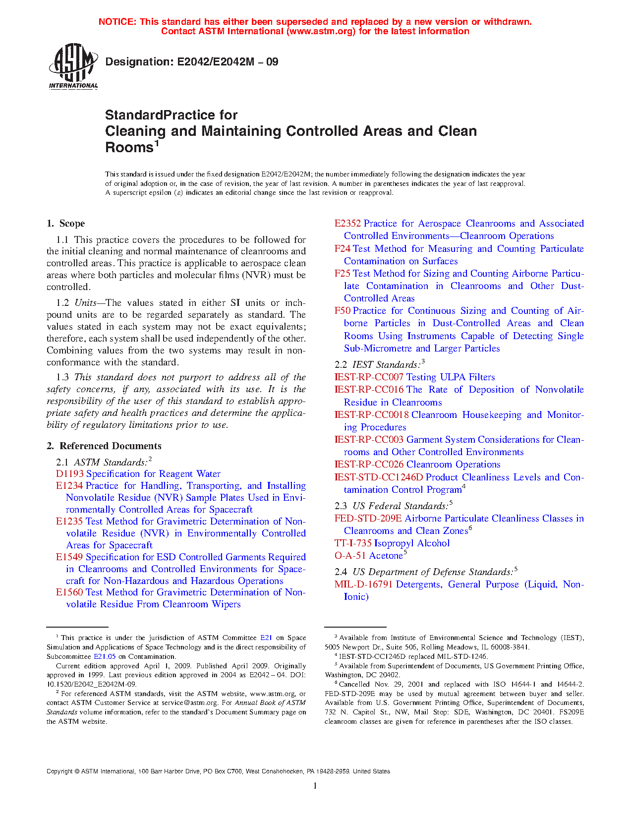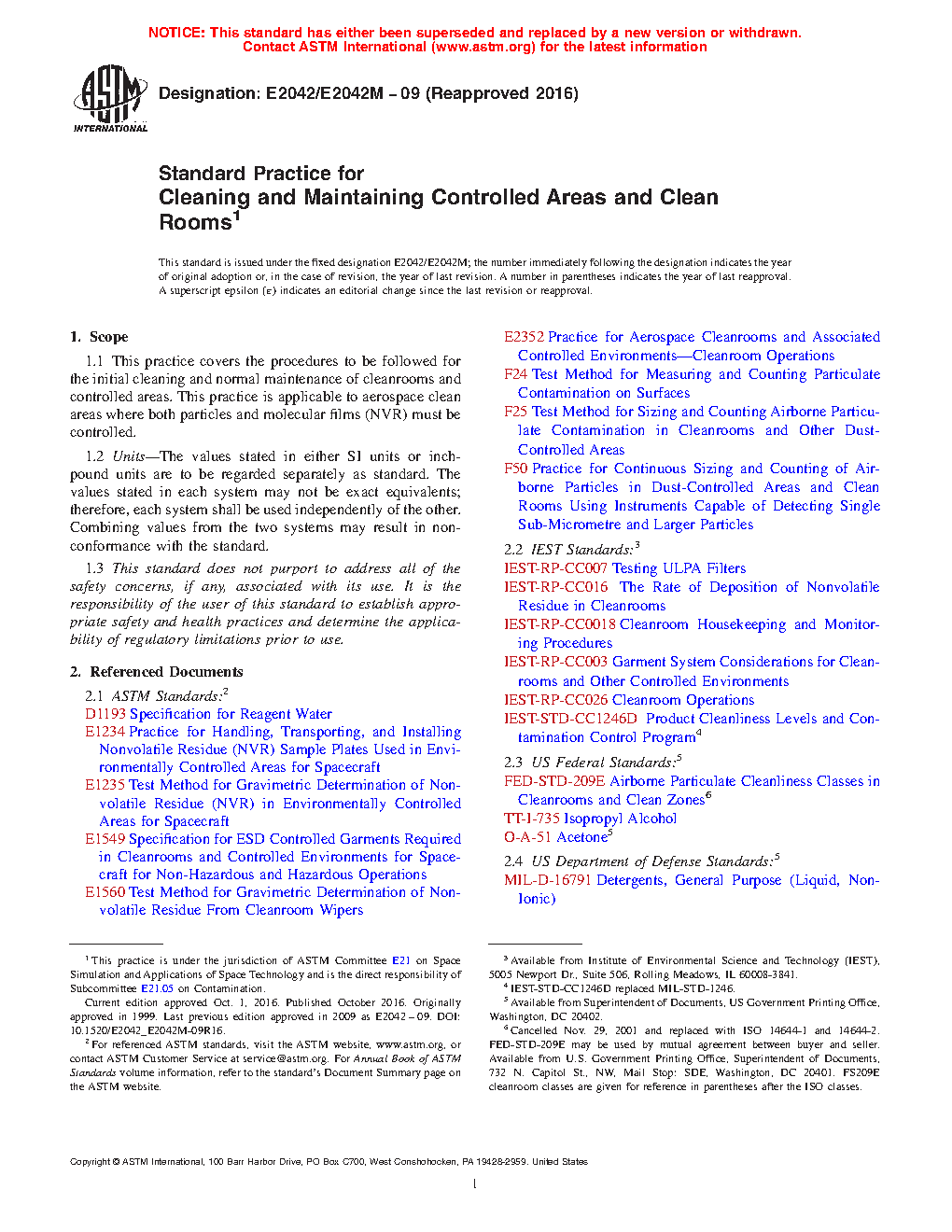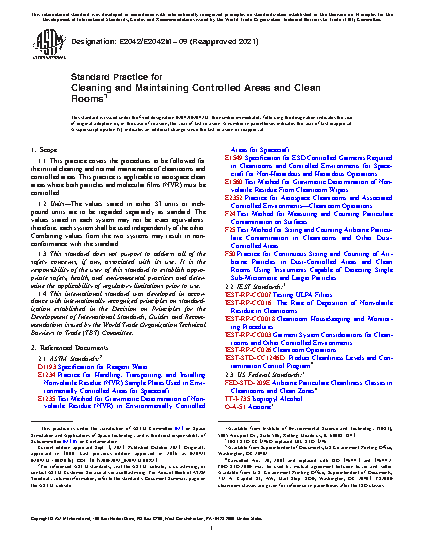 1.1 This practice covers the procedures to be followed for the initial cleaning and normal maintenance of cleanrooms and controlled areas. This practice is applicable to aerospace clean areas where both particles and molecular films (NVR) must be controlled.