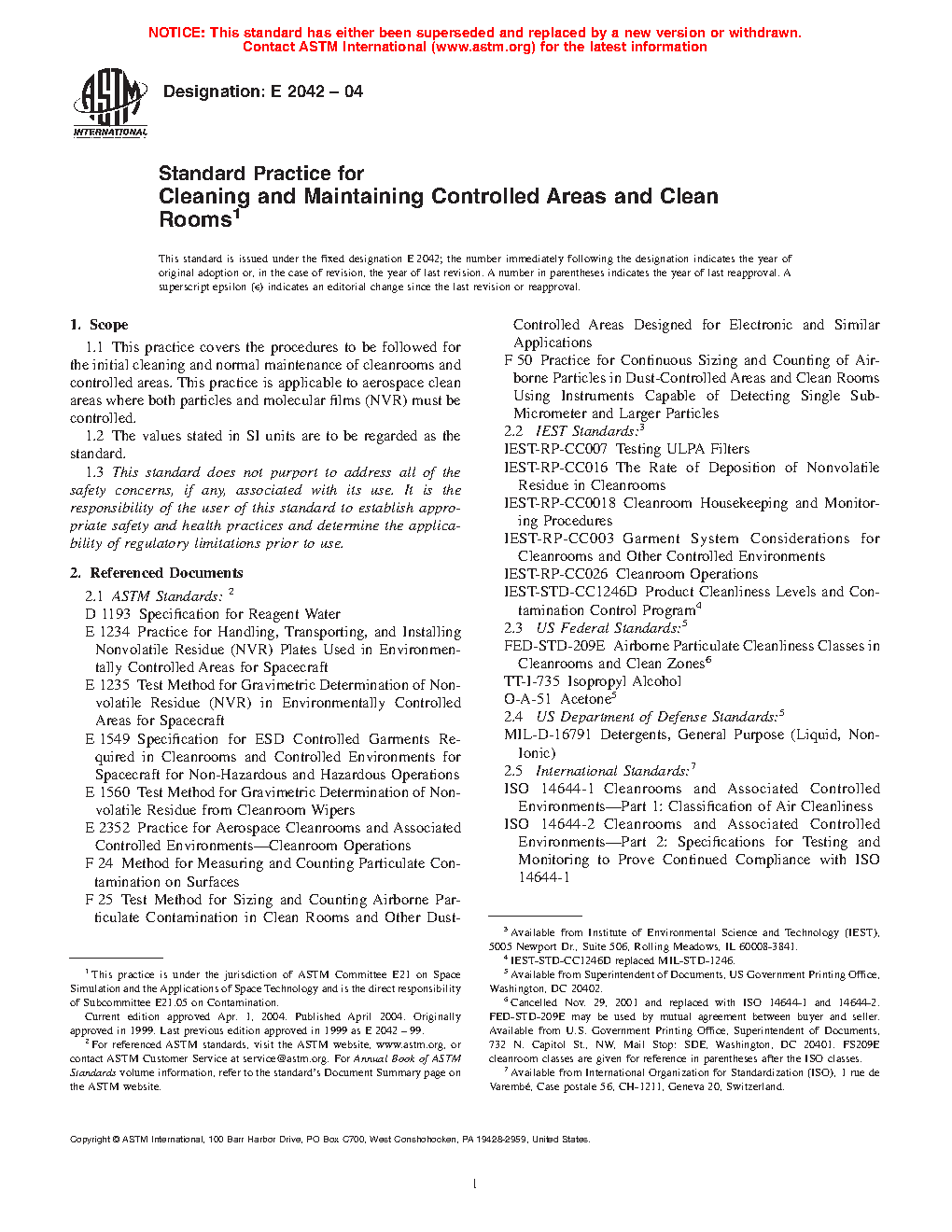 This practice identifies methods for cleaning and maintaining controlled areas and clean rooms as defined by ISO 14644-1 and ISO 14644-2. Cleaning procedures are described, and cleaning frequency for different classes of facility are given. Compliance with this practice will make it easier and more likely that the required level of facility cleanliness will be maintained. A cleaner facility also will help to protect flight hardware from contamination and should reduce the frequency for cleaning flight hardware. This practice does not discuss operation and operational procedures for cleanrooms and controlled areas. Other documents such as IEST-RP-CC026 and Practice E 2352