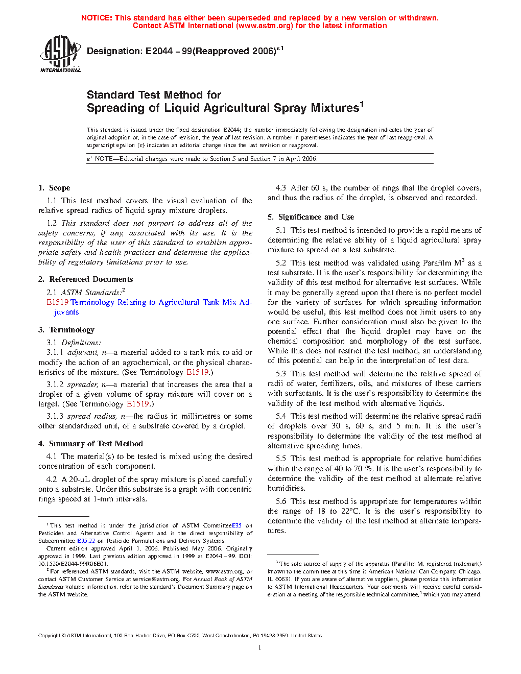 5.2 This test method was validated using Parafilm M3 as a test substrate. It is the user's responsibility for determining the validity of this test method for alternative test surfaces. While it may be generally agreed upon that there is no perfect model for the variety of surfaces for which spreading information would be useful, this test method does not limit users to any one surface. Further consideration must also be given to the potential effect that the liquid droplet may have on the chemical composition and morphology of the test surface. While this does not restrict the test method, an understanding of this potential can help in the interpretation of test data.
