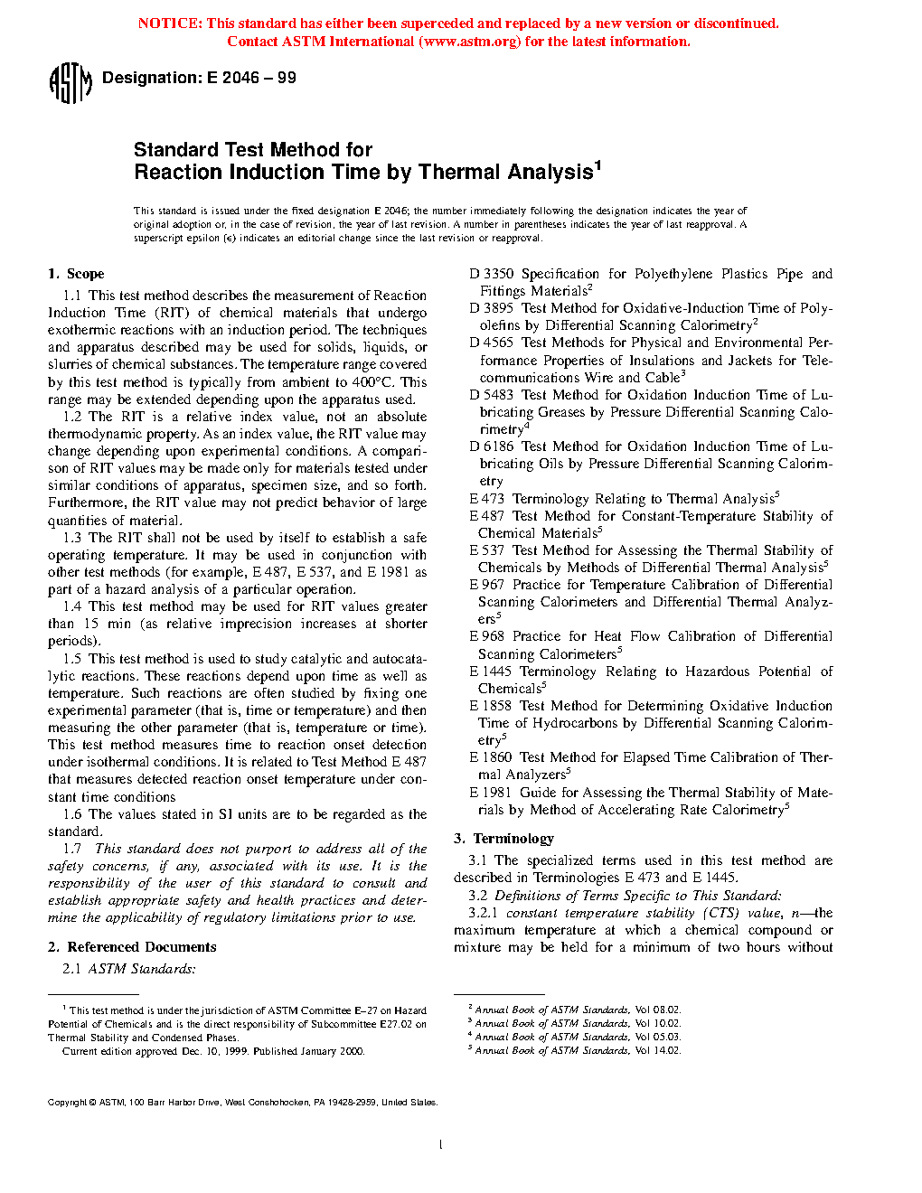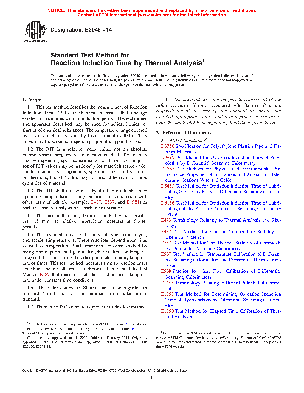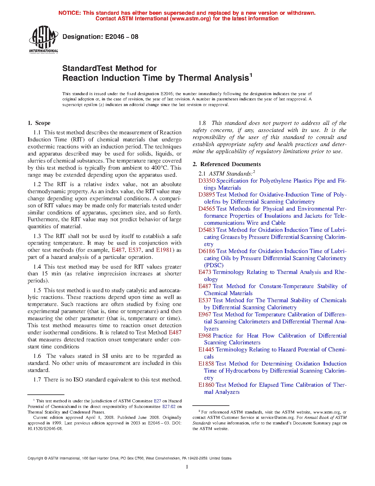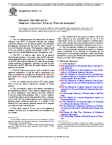 1.1 This test method describes the measurement of reaction induction time (RIT) of chemical materials that undergo exothermic reactions with an induction period. The techniques and apparatus described may be used for solids, liquids, or slurries of chemical substances. The temperature range covered by this test method is typically from ambient to 400 °C. This range may be extended depending upon the apparatus used.