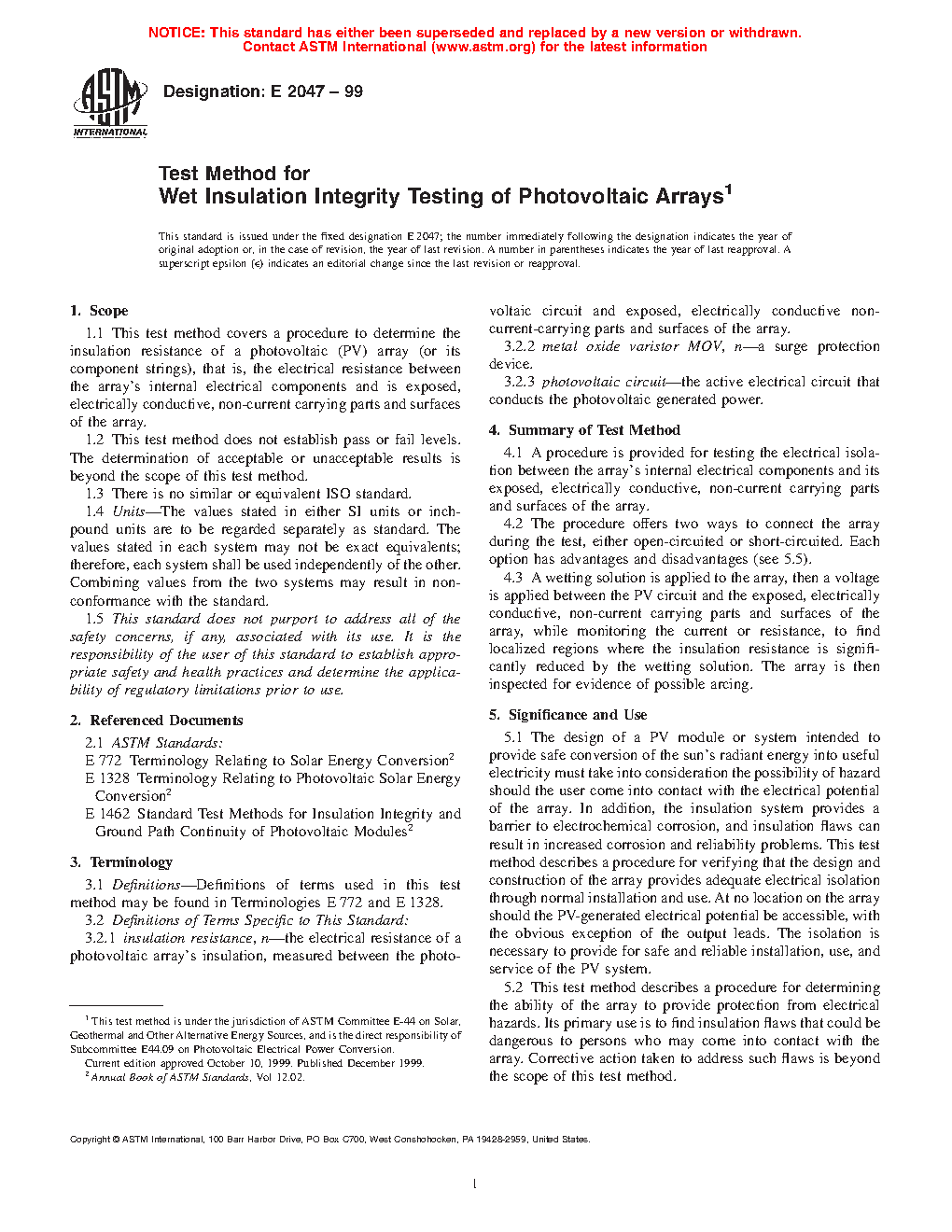 1.1 This test method covers a procedure to determine the insulation resistance of a photovoltaic (PV) array (or its component strings), that is, the electrical resistance between the array's internal electrical components and is exposed, electrically conductive, non-current carrying parts and surfaces of the array.
