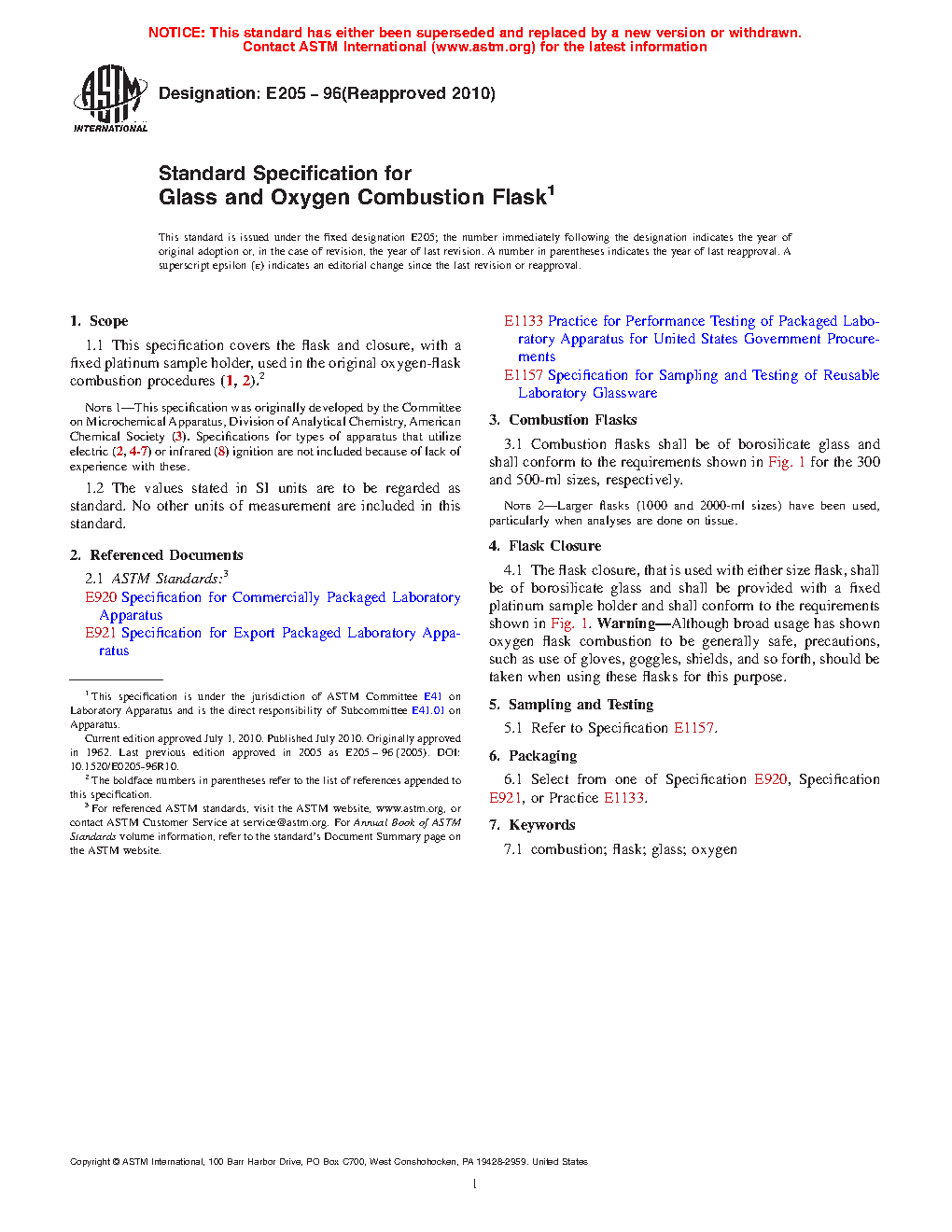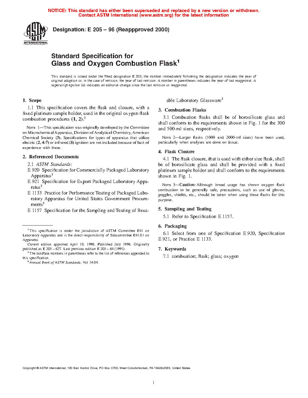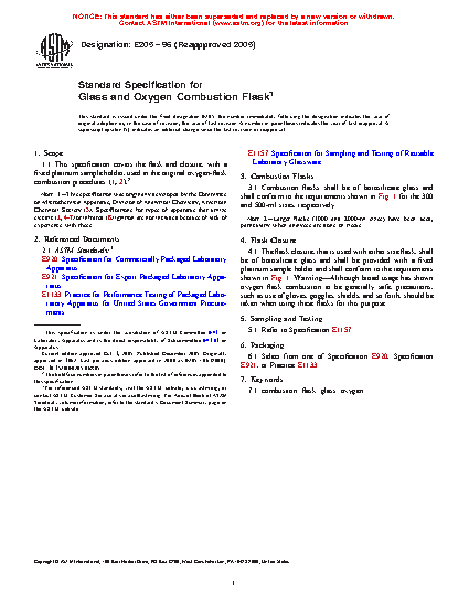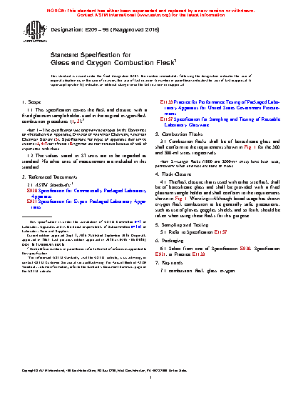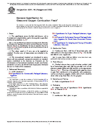This specification covers the design and dimensional requirements for flasks and closures, with a fixed platinum sample holder, used in the original oxygen-flask combustion procedures.