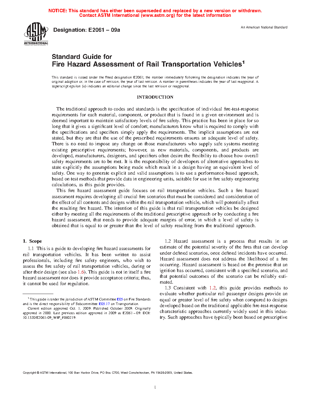 1.1 This is a guide to developing fire hazard assessments for rail transportation vehicles. It has been written to assist professionals, including fire safety engineers, who wish to assess the fire safety of rail transportation vehicles, during or after their design (see also 1.6). This guide is not in itself a fire hazard assessment nor does it provide acceptance criteria; thus, it cannot be used for regulation.
