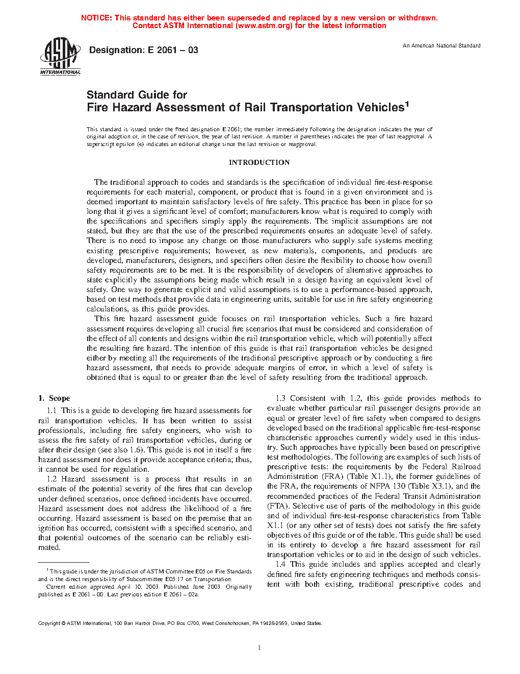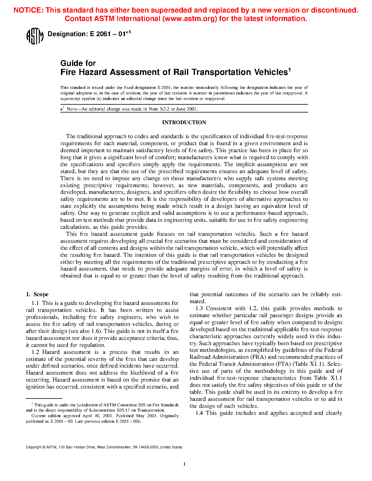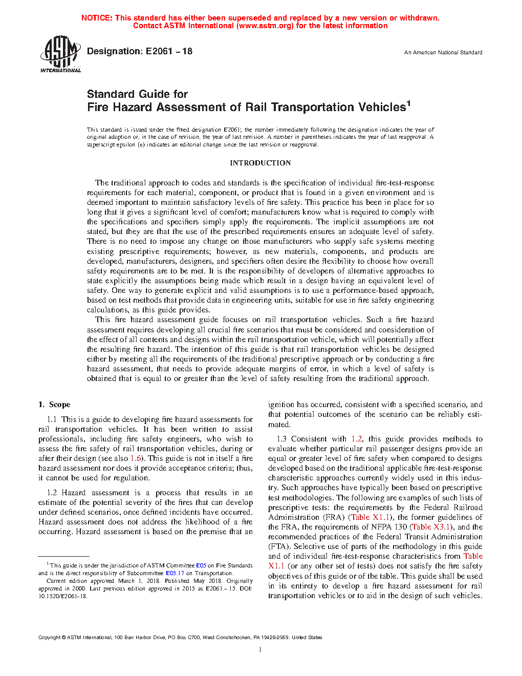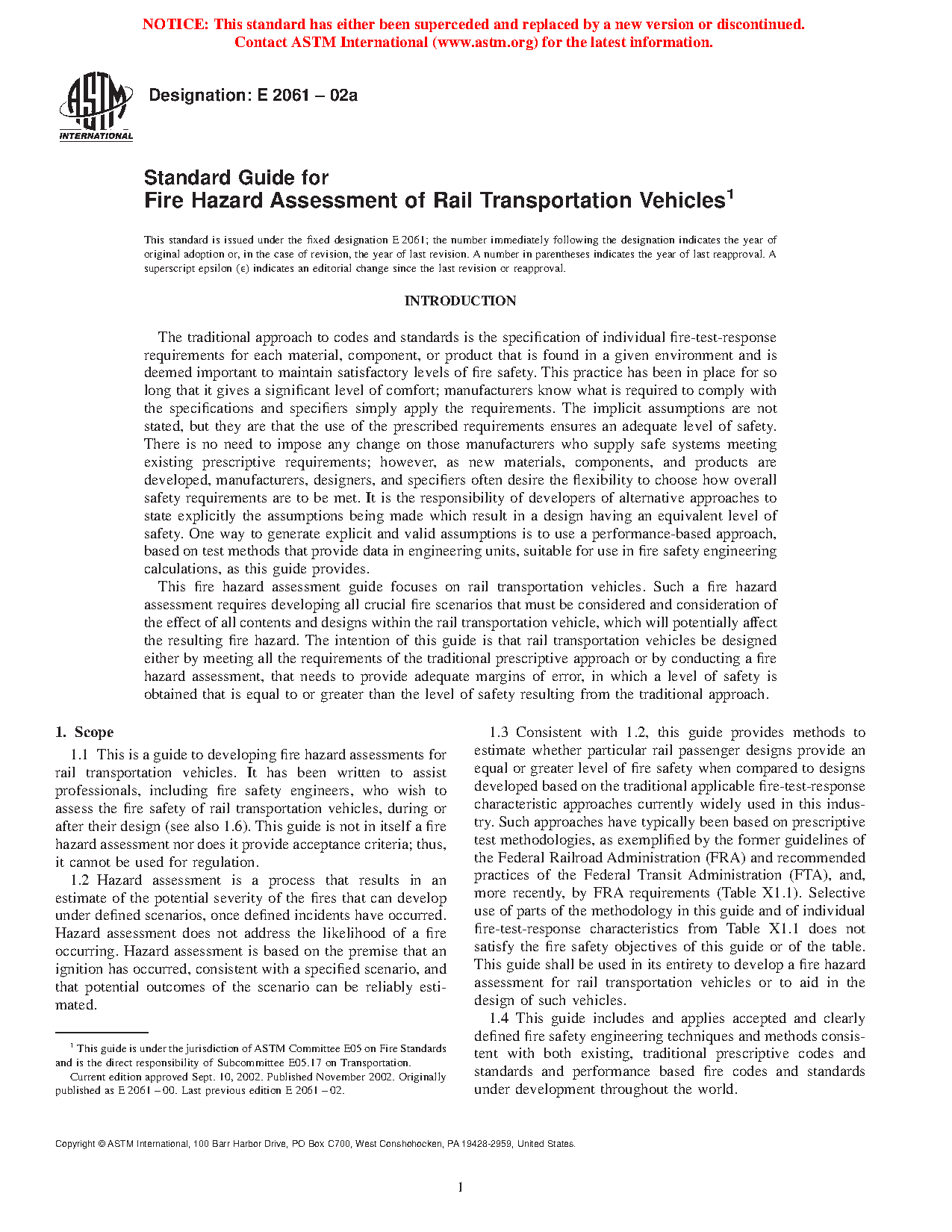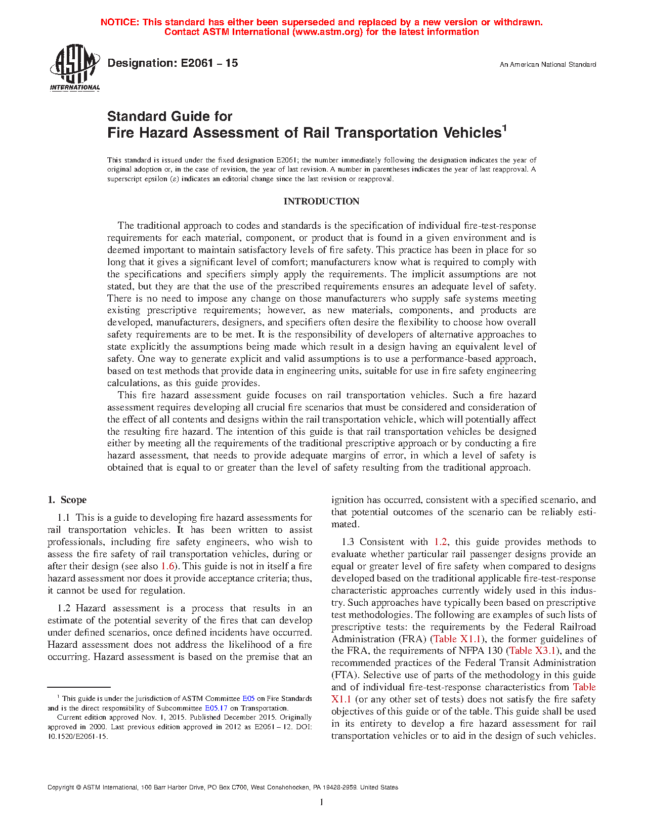 1.3 Consistent with 1.2, this guide provides methods to estimate whether particular rail passenger designs provide an equal or greater level of fire safety when compared to designs developed based on the traditional applicable fire-test-response characteristic approaches currently widely used in this industry. Such approaches have typically been based on prescriptive test methodologies, as exemplified by guidelines of the Federal Railroad Administration (FRA) and recommended practices of the Federal Transit Administration (FTA) (Table X1.1). Selective use of parts of the methodology in this guide and of individual fire-test-response characteristics from Table X1.1 does not satisfy the fire safety objectives of this guide or of the table. This guide shall be used in its entirety to develop a fire hazard assessment for rail transportation vehicles or to aid in the design of such vehicles.