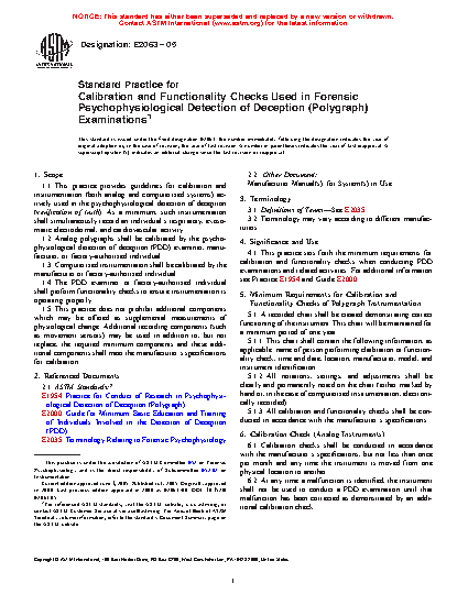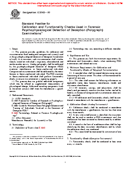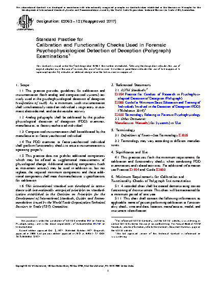 1.1 This practice provides guidelines for calibration and instrumentation (both analog and computerized systems) actively used in the psychophysiological detection of deception (verification of truth). As a minimum, such instrumentation shall simultaneously record an individual’s respiratory, exosomatic electrodermal, and cardiovascular activity.