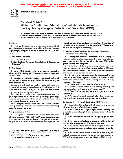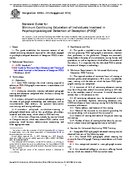 1.1 This guide establishes the minimum amount of advanced continuing education required for individuals engaged in psychophysiological detection of deception (PDD) examinations.