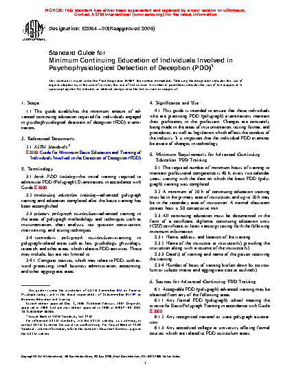 Standard Guide for Minimum Continuing Education of Individuals Involved in Psychophysiological Detection of Deception (PDD) (Withdrawn 2023)