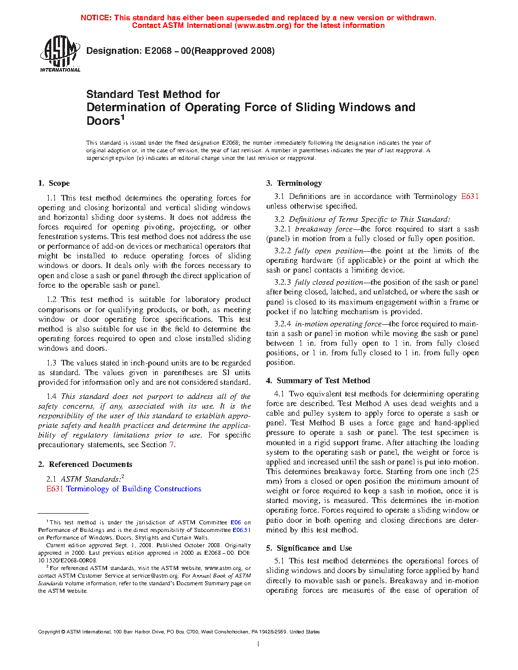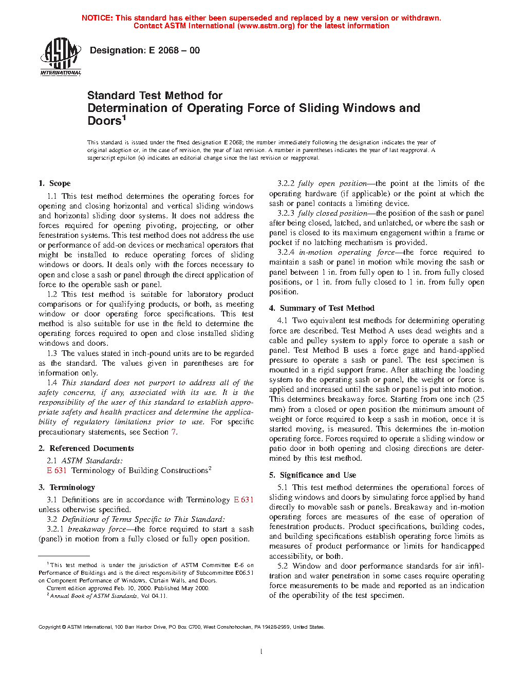 5.2 Window and door performance standards for air infiltration and water penetration in some cases require operating force measurements to be made and reported as an indication of the operability of the test specimen.