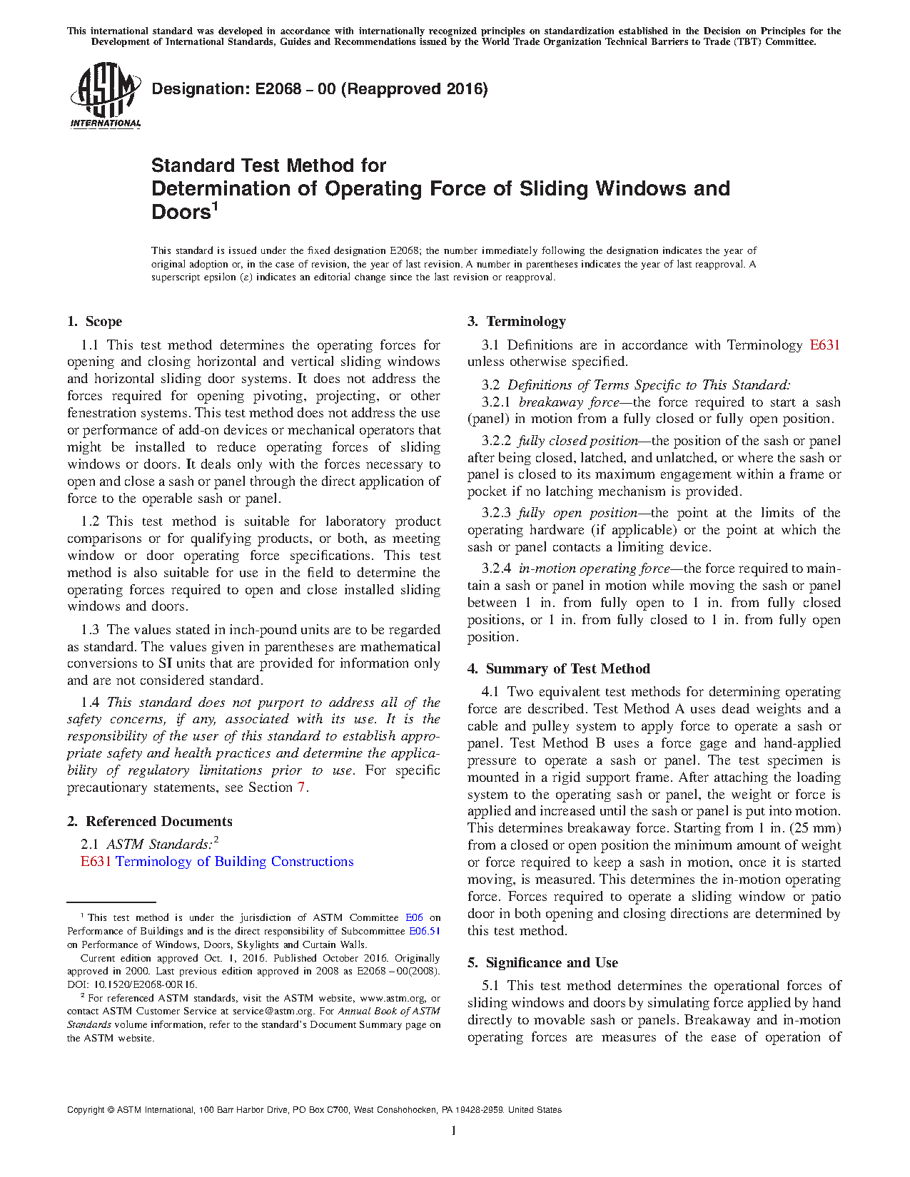 1.2 This test method is suitable for laboratory product comparisons or for qualifying products, or both, as meeting window or door operating force specifications. This test method is also suitable for use in the field to determine the operating forces required to open and close installed sliding windows and doors.