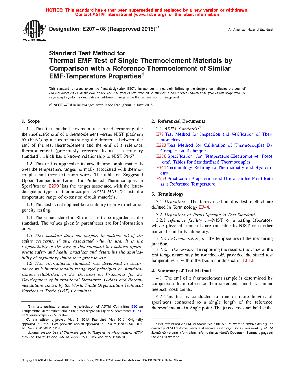 1.2 This test is applicable to new thermocouple materials over the temperature ranges normally associated with thermocouples and their extension wires. The table on Suggested Upper Temperature Limits for Protected Thermocouples in Specification E230 lists the ranges associated with the letter-designated types of thermocouples. ASTM MNL-122 lists the temperature range of extension circuit materials.