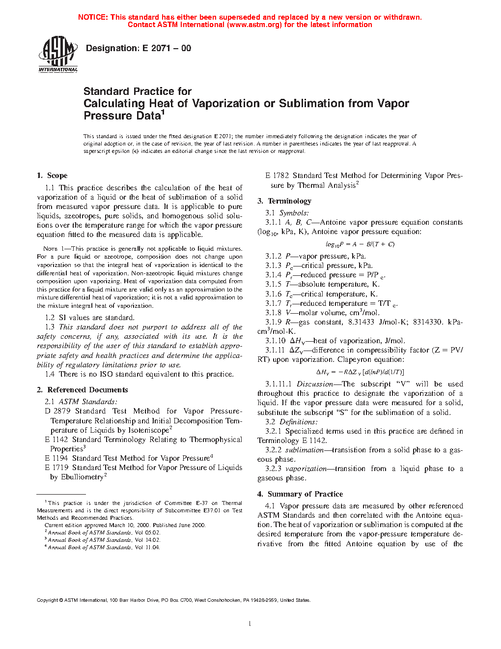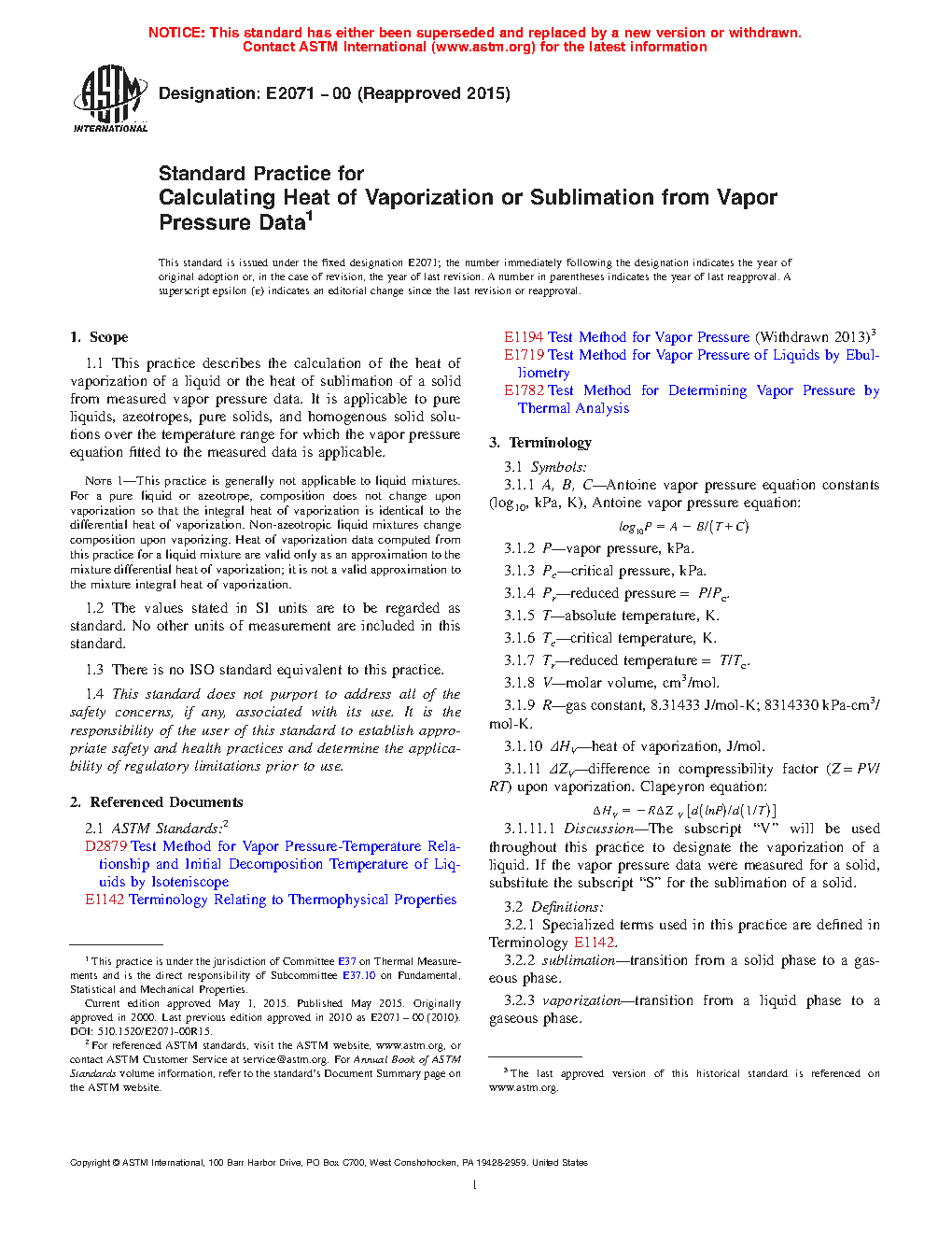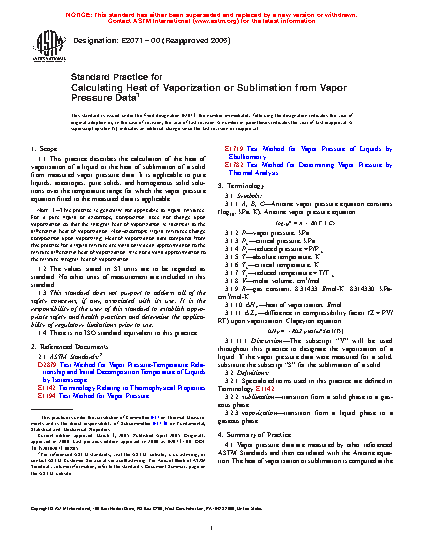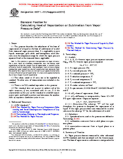 1.1 This practice describes the calculation of the heat of vaporization of a liquid or the heat of sublimation of a solid from measured vapor pressure data. It is applicable to pure liquids, azeotropes, pure solids, and homogenous solid solutions over the temperature range for which the vapor pressure equation fitted to the measured data is applicable.
