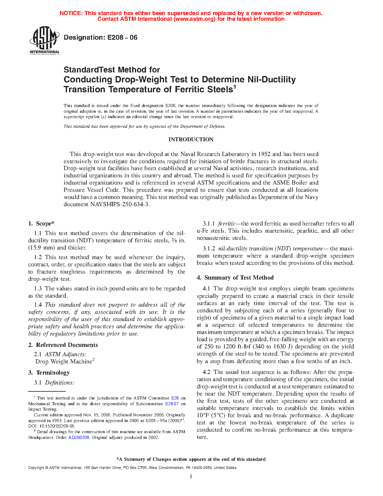 1.1 This test method covers the determination of the nil-ductility transition (NDT) temperature of ferritic steels, 5/8 in. (15.9 mm) and thicker.