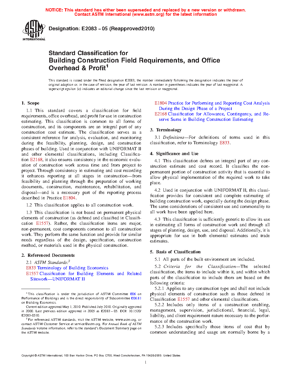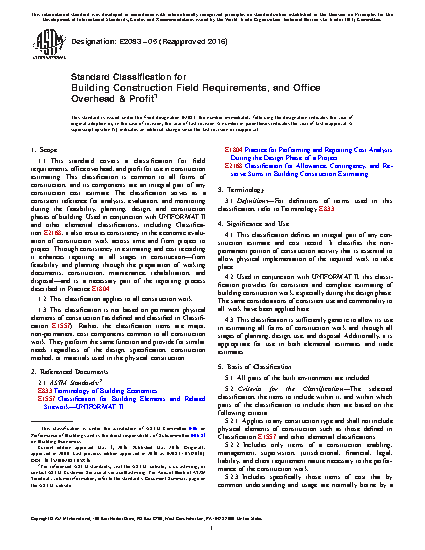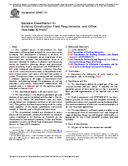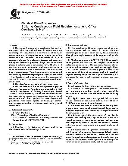 1.1 This standard establishes a classification for field requirements, office overhead, and profit for use in construction estimating. This classification is common to all forms of construction, and its components are an integral part of any construction cost estimate. The classification serves as a consistent reference for analysis, evaluation, and monitoring during the feasibility, planning, design, and construction phases of building. Used in conjunction with UNIFORMAT II and other elemental classifications, it also ensures consistency in the economic evaluation of construction work overtime and from project to project. Through consistency in estimating and cost recording it enhances reporting at all stages in construction - from feasibility and planning through the preparation of working documents, construction, maintenance, rehabilitation, and disposal.