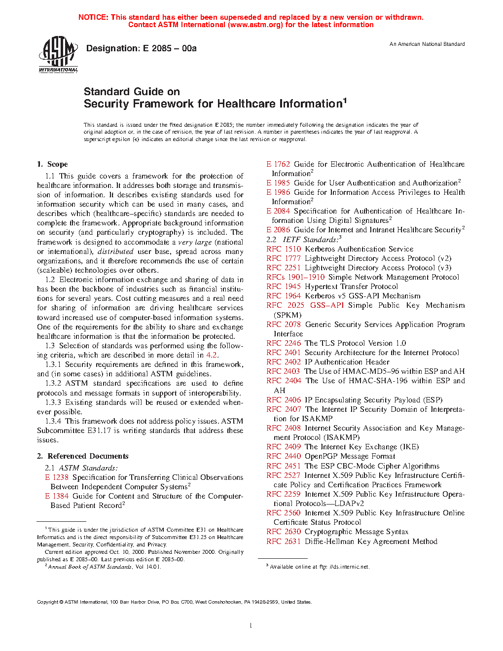1.1 This guide covers a framework for the protection of healthcare information. It addresses both storage and transmission of information. It describes existing standards used for information security which can be used in many cases, and describes which (healthcare-specific) standards are needed to complete the framework. Appropriate background information on security (and particularly cryptography) is included. The framework is designed to accommodate a very large (national or international), distributed user base, spread across many organizations, and it therefore recommends the use of certain (scaleable) technologies over others.