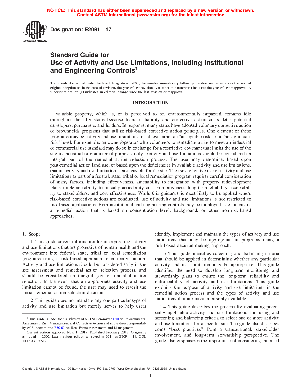 1.1 This guide covers information for incorporating activity and use limitations that are protective of human health and the environment into federal, state, tribal or local remediation programs using a risk-based approach to corrective action. Activity and use limitations should be considered early in the site assessment and remedial action selection process, and should be considered an integral part of remedial action selection. In the event that an appropriate activity and use limitation cannot be found, the user may need to revisit the initial remedial action selection decision.