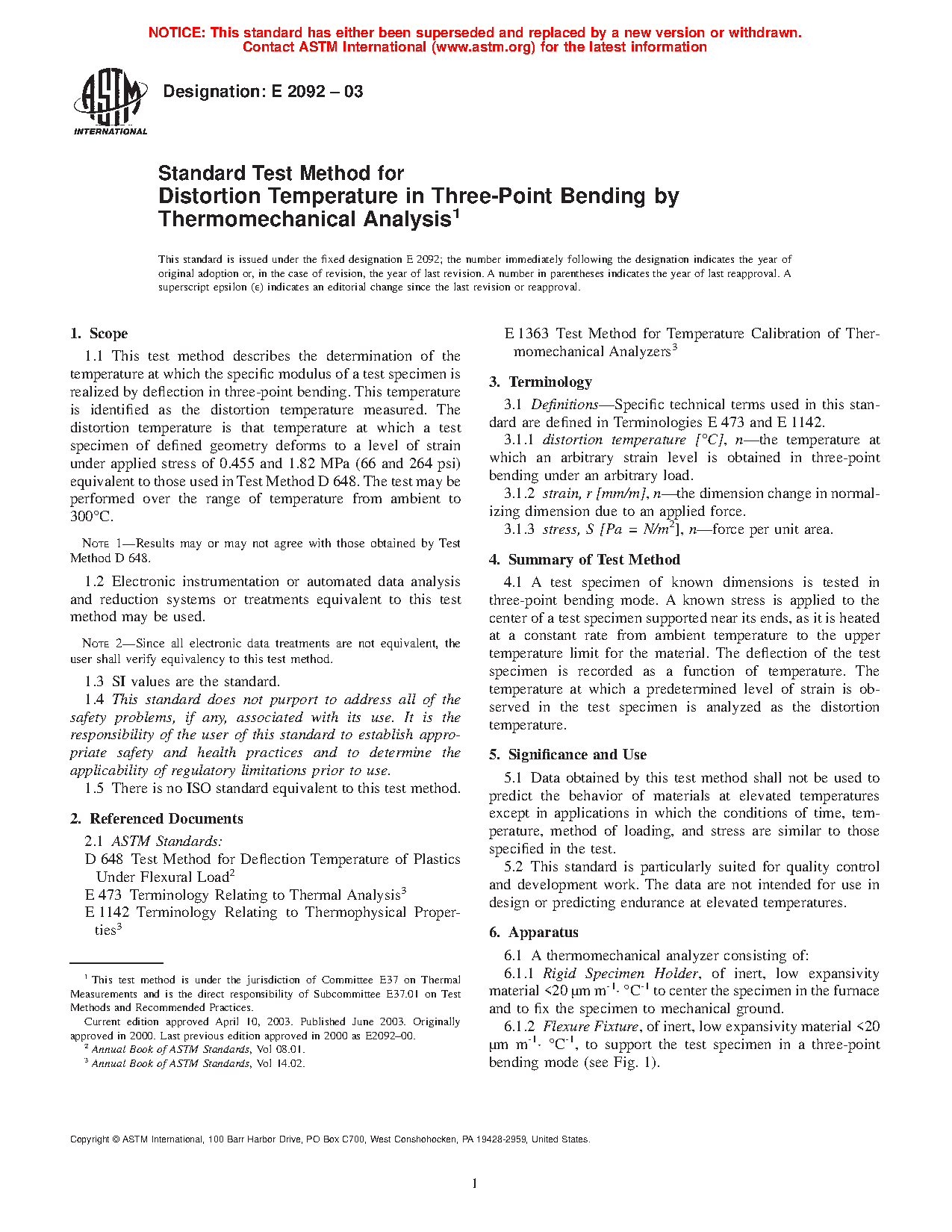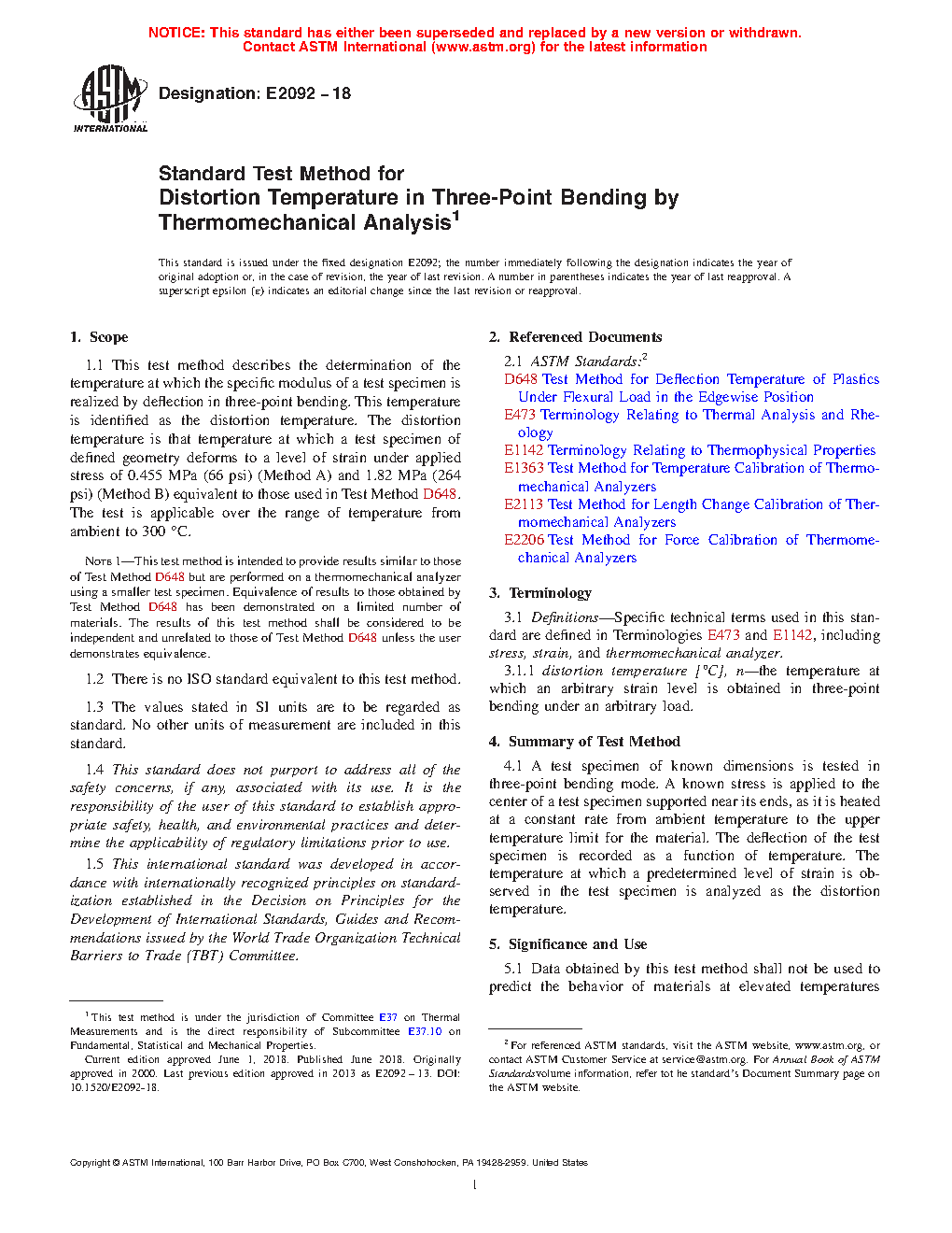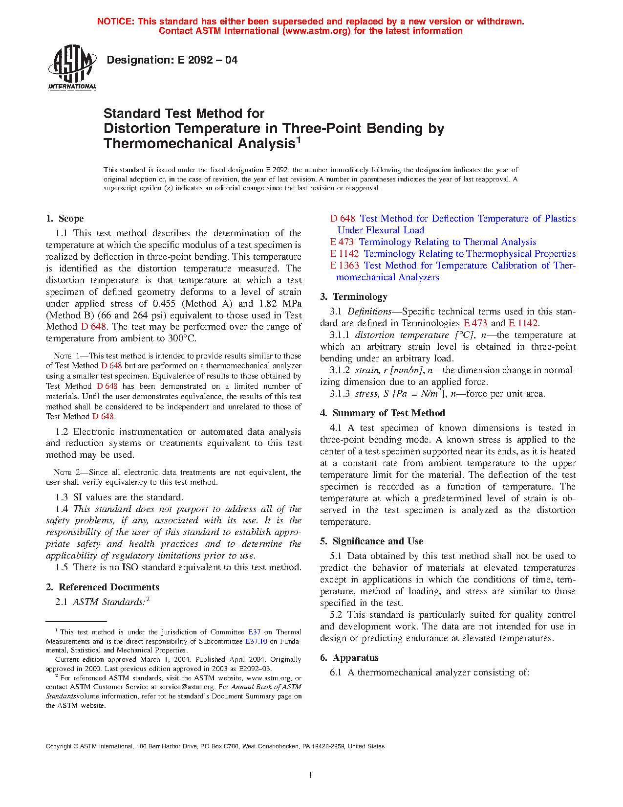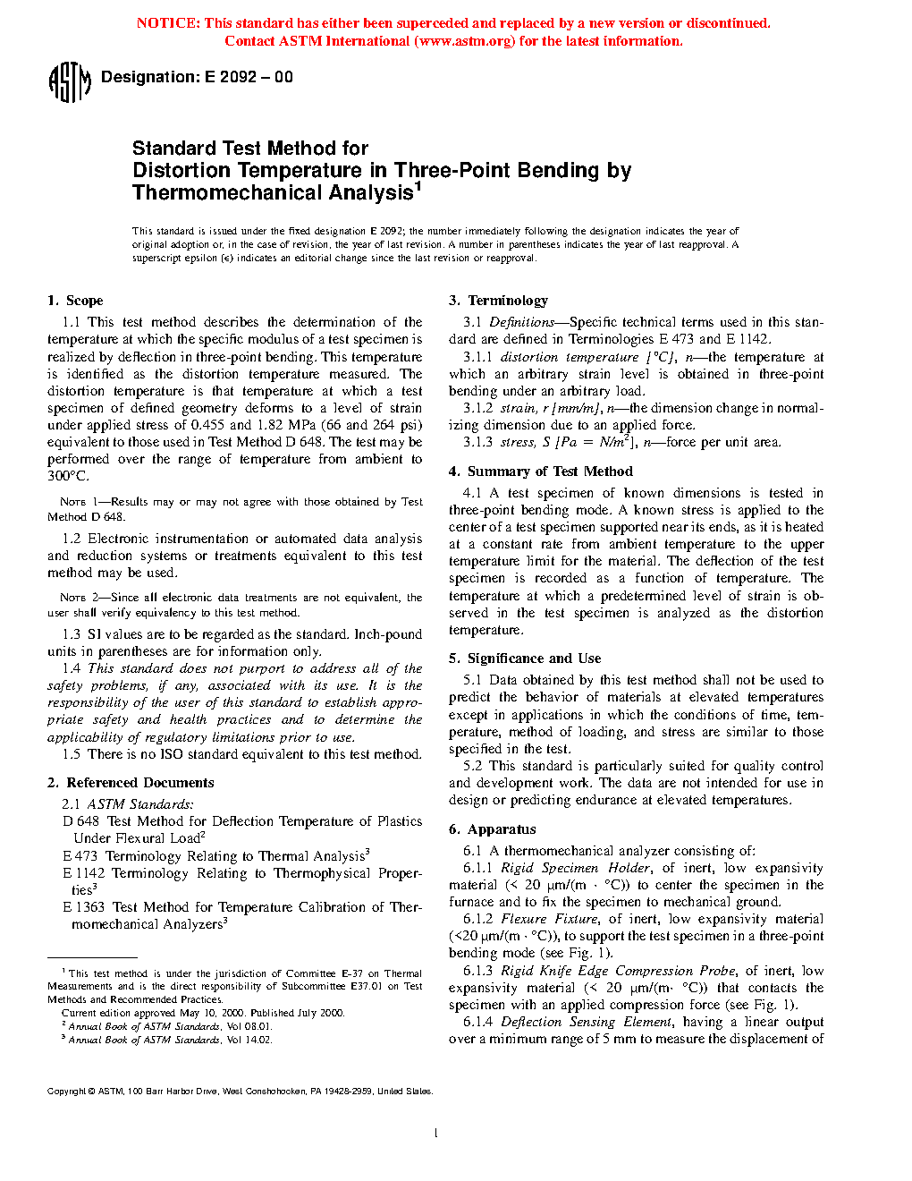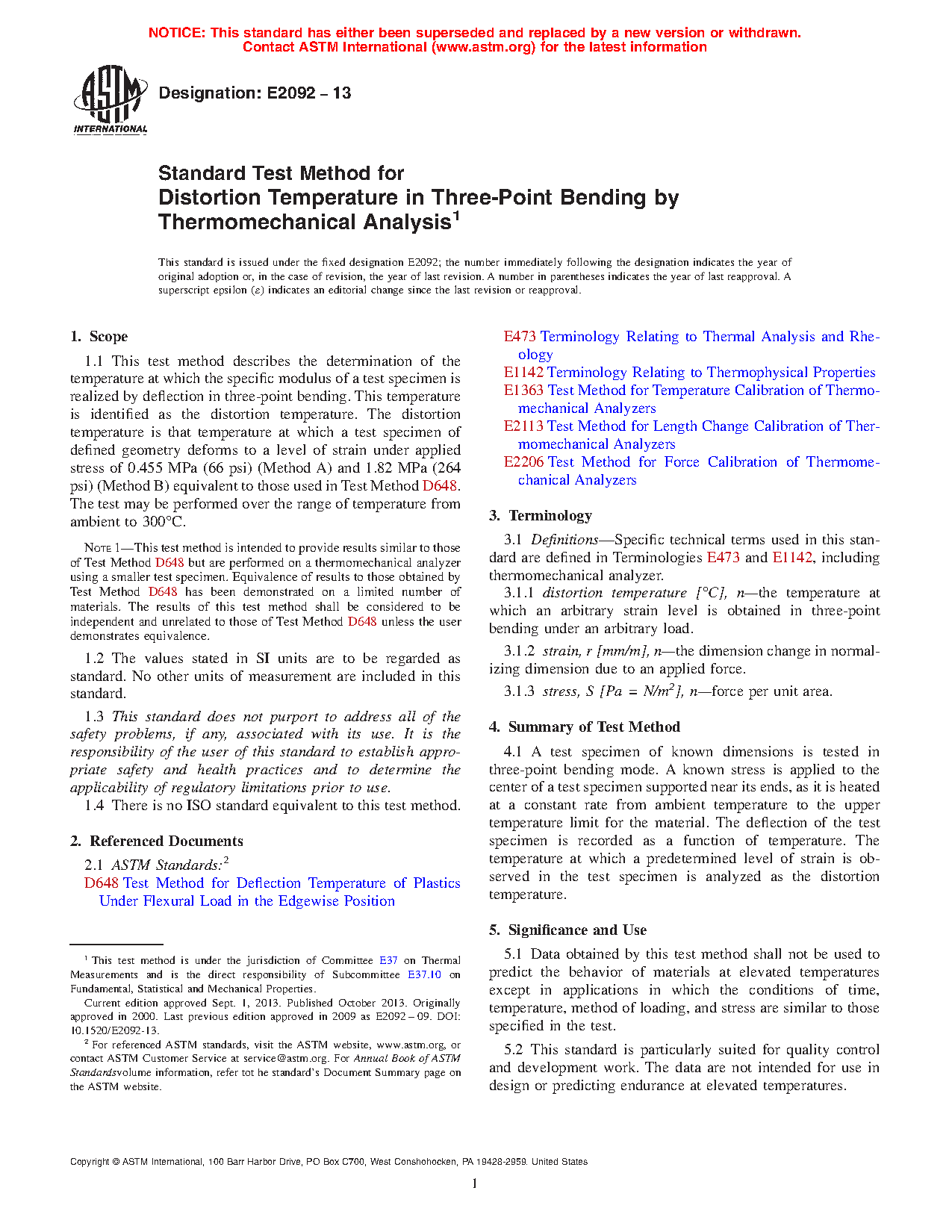 Note 1: This test method is intended to provide results similar to those of Test Method D648 but is performed on a thermomechanical analyzer using a smaller test specimen. Equivalence of results to those obtained by Test Method D648 has been demonstrated on a limited number of materials. The results of this test method shall be considered to be independent and unrelated to those of Test Method D648 unless the user demonstrates equivalence.