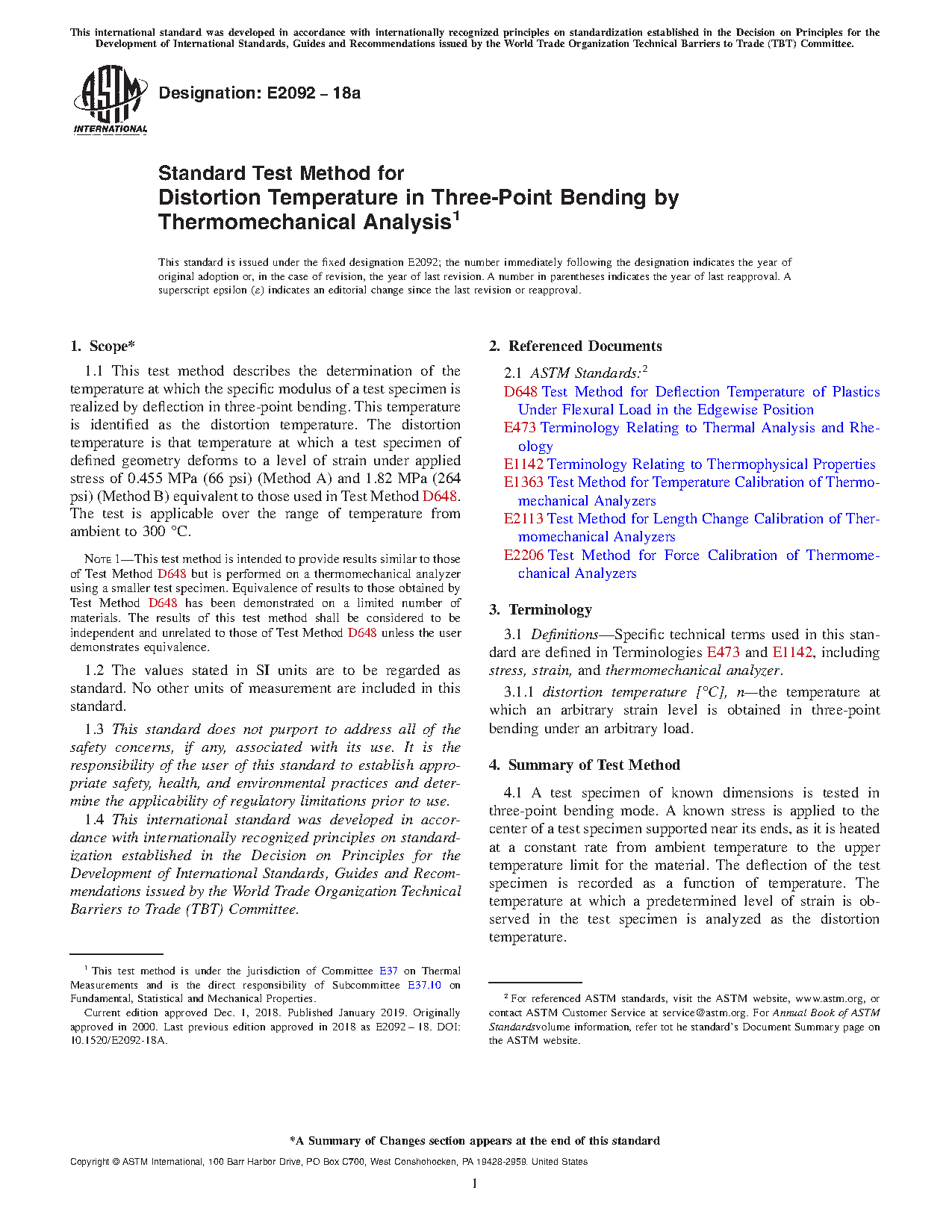 1.1 This test method describes the determination of the temperature at which the specific modulus of a test specimen is realized by deflection in three-point bending. This temperature is identified as the distortion temperature. The distortion temperature is that temperature at which a test specimen of defined geometry deforms to a level of strain under applied stress of 0.455 MPa (66 psi) (Method A) and 1.82 MPa (264 psi) (Method B) equivalent to those used in Test Method D648. The test is applicable over the range of temperature from ambient to 300 °C.