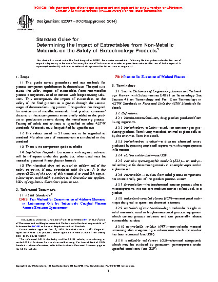 1.1 This guide covers procedures and test methods for process component qualification by the end user. The goal is to assess the safety impact of extractables from non-metallic process components used in contact with bioprocessing solutions. This encompasses the impact of extractables on the safety of the final product as it passes through the various stages of the manufacturing process. This guide is not designed for evaluation of metallic materials, final product container/closures or those components intentionally added to the product or production streams during the manufacturing process. Testing of solids and extracts is specified in other ASTM standards. Materials must be qualified by specific use.