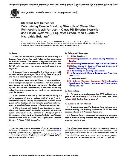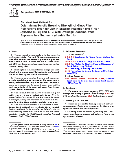 1.1 This test method covers procedures for determining the breaking force of glass fiber mesh following their conditioning in an alkali solution. The method is applicable to glass fiber mesh used in Exterior Insulation and Finish Systems (EIFS) and EIFS with drainage with base coats that contain portland cement as an ingredient.