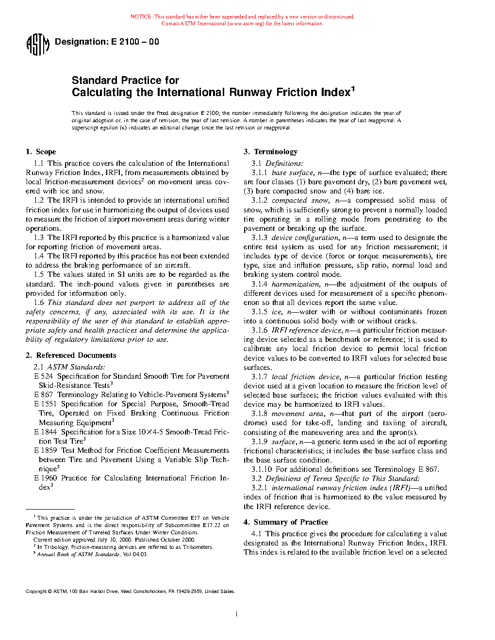 1.1 This practice covers the calculation of the International Runway Friction Index, IRFI, from measurements obtained by local friction-measurement devices2 on movement areas under winter conditions.