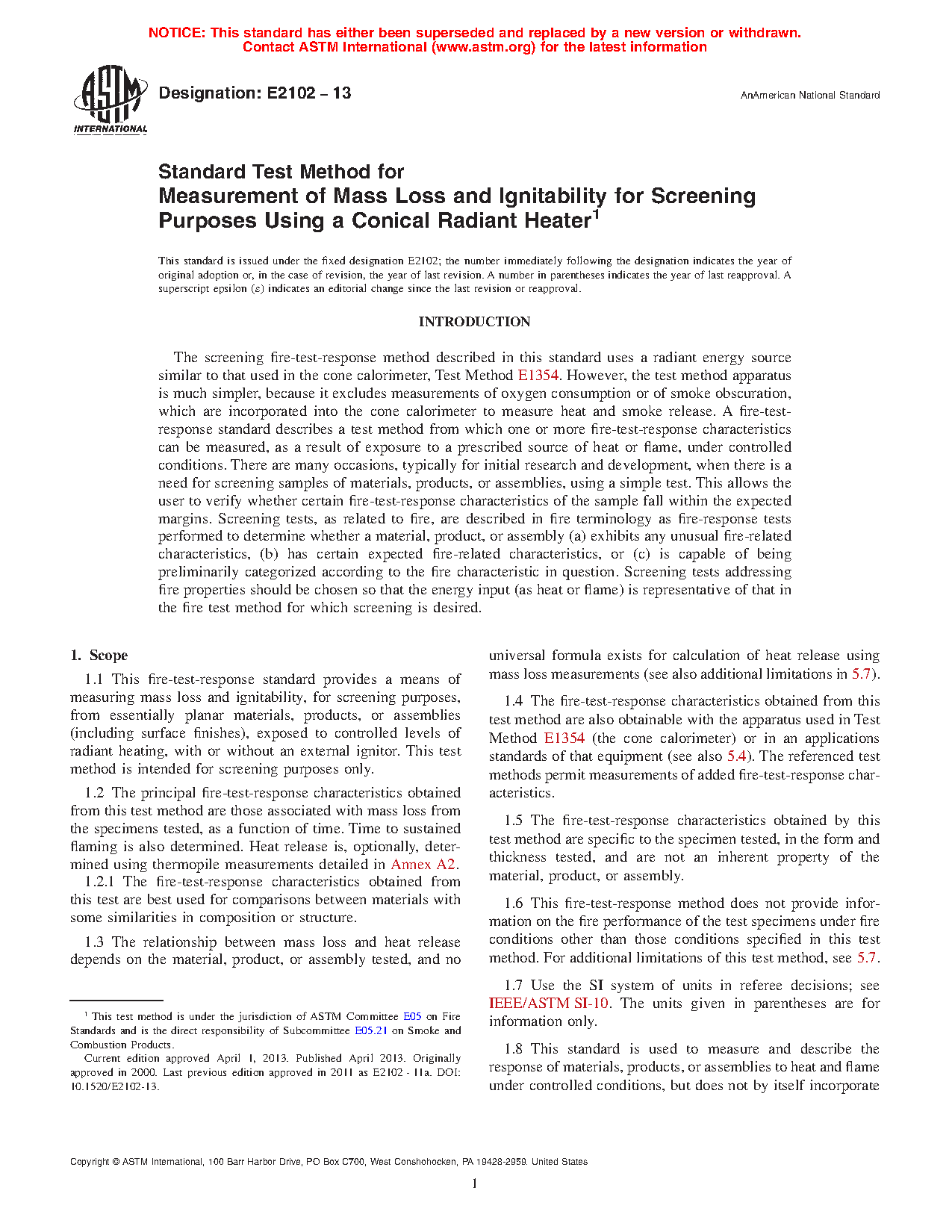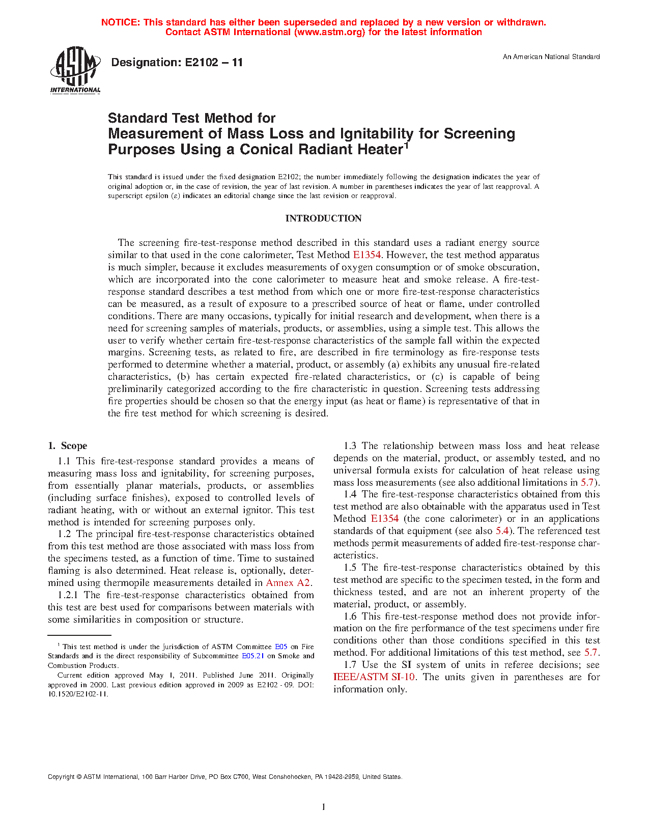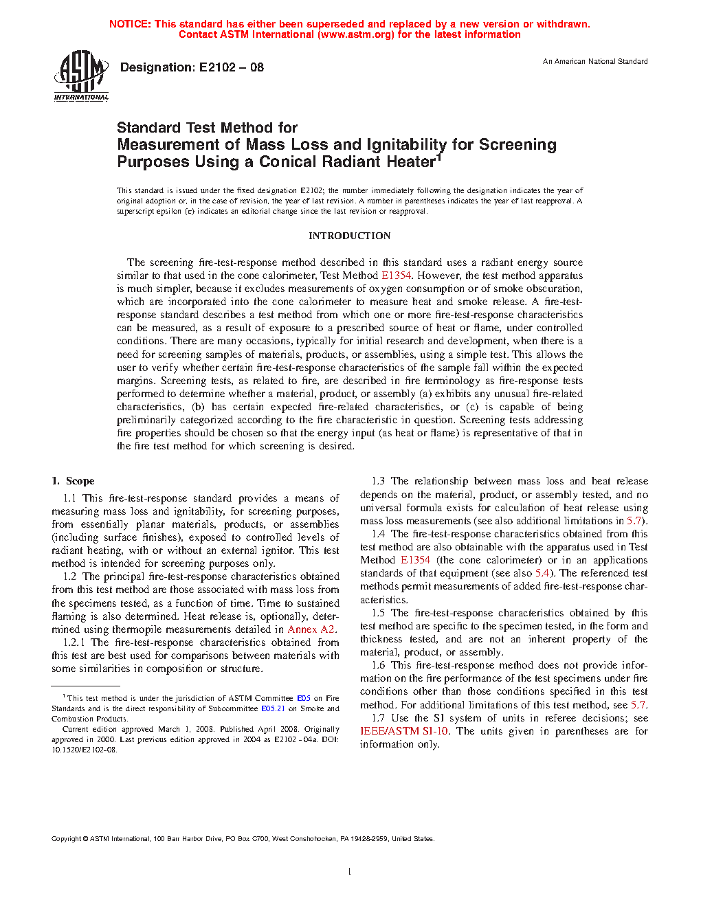 1.1 This fire-test-response standard provides a means of measuring mass loss and ignitability, for screening purposes, from essentially planar materials, products, or assemblies (including surface finishes), exposed to controlled levels of radiant heating, with or without an external ignitor. This test method is intended for screening purposes only.