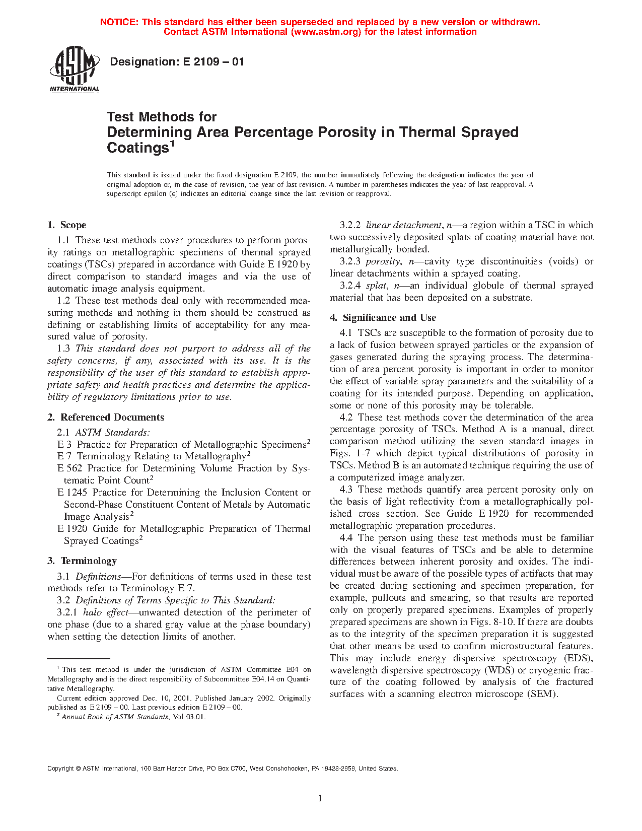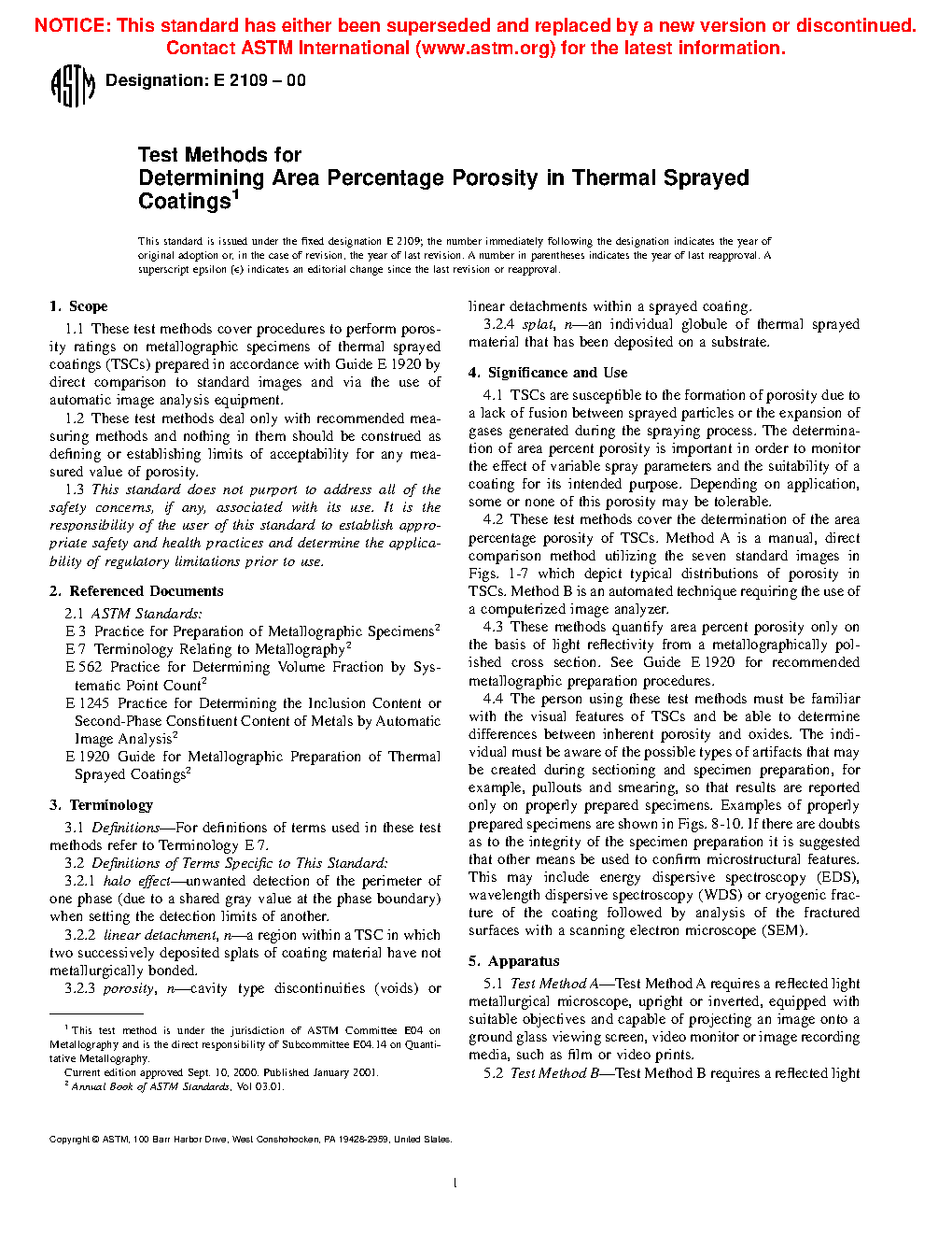 1.1 These test methods cover procedures to perform porosity ratings on metallographic specimens of thermal sprayed coatings (TSCs) prepared in accordance with Guide E1920 by direct comparison to standard images and via the use of automatic image analysis equipment.