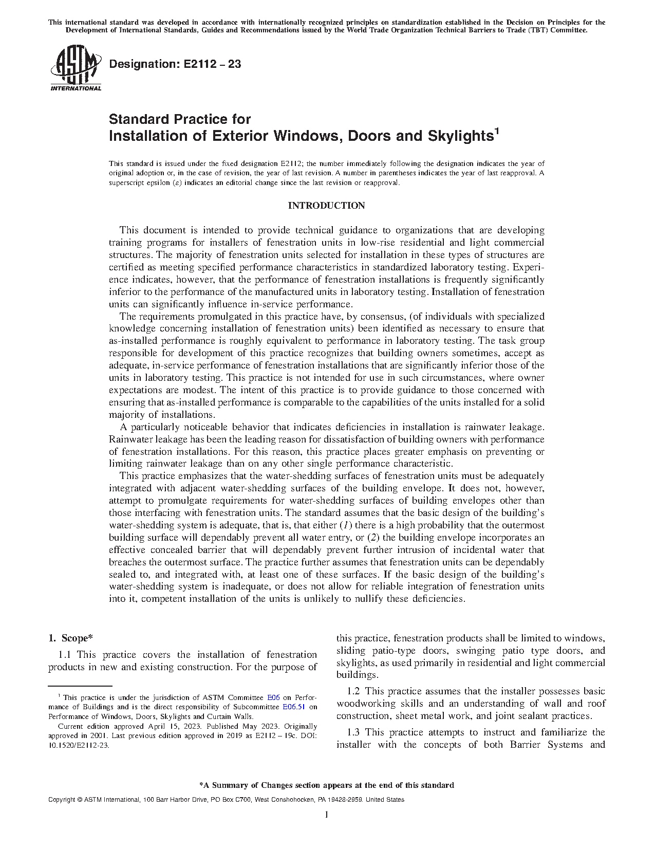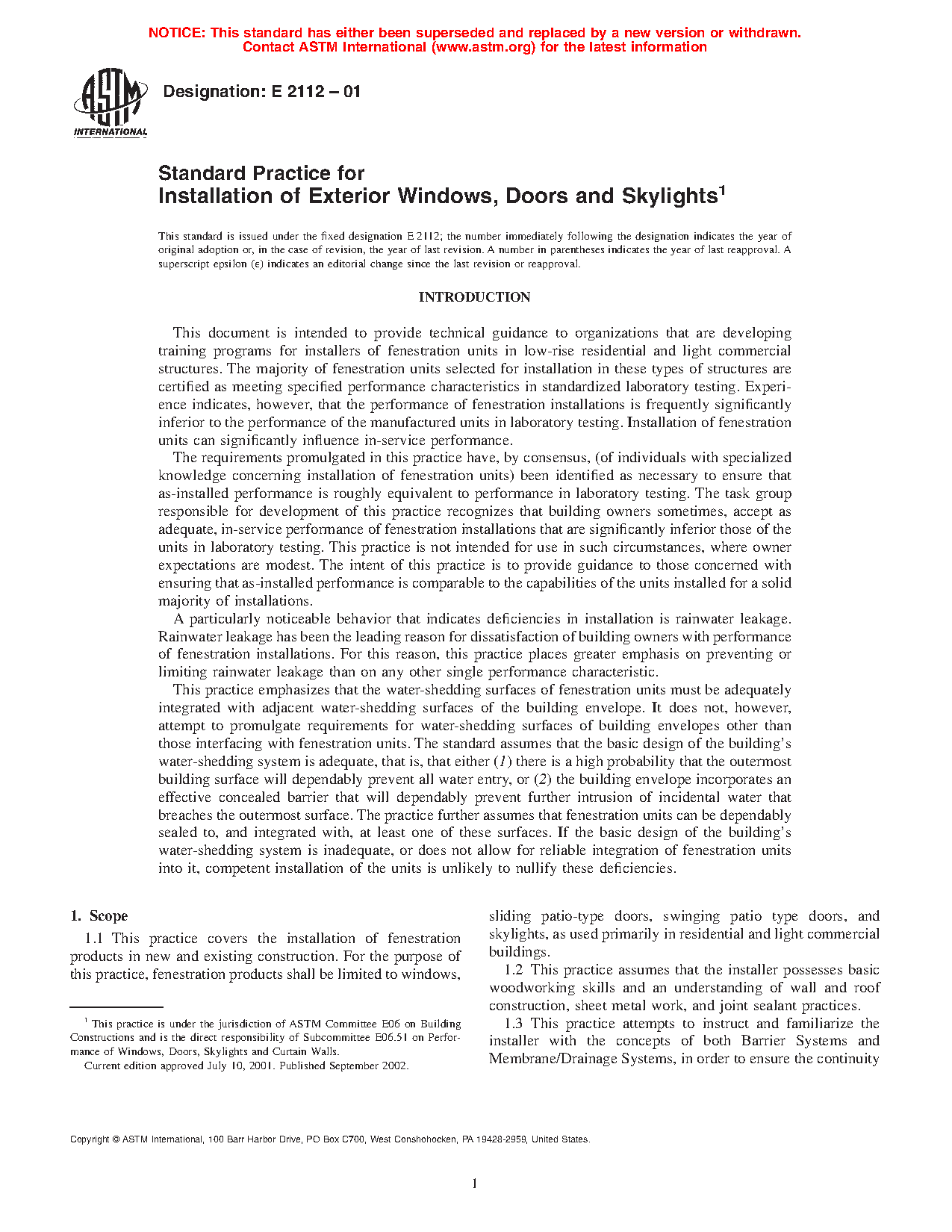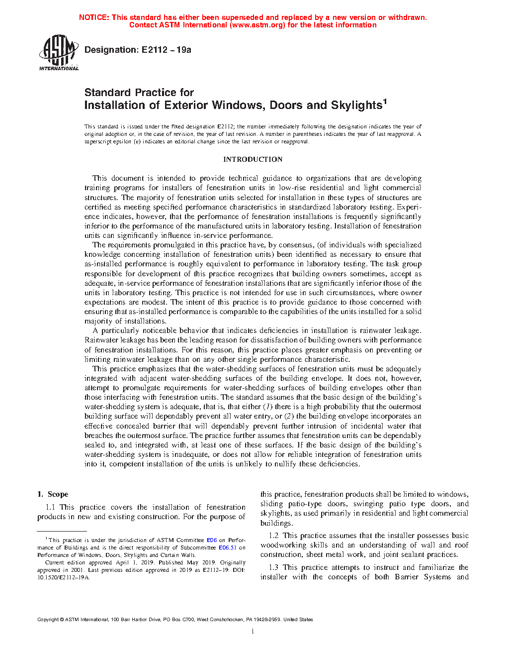 1.1 This practice covers the installation of fenestration products in new and existing construction. For the purpose of this practice, fenestration products shall be limited to windows, sliding patio-type doors, swinging patio type doors, and skylights, as used primarily in residential and light commercial buildings.