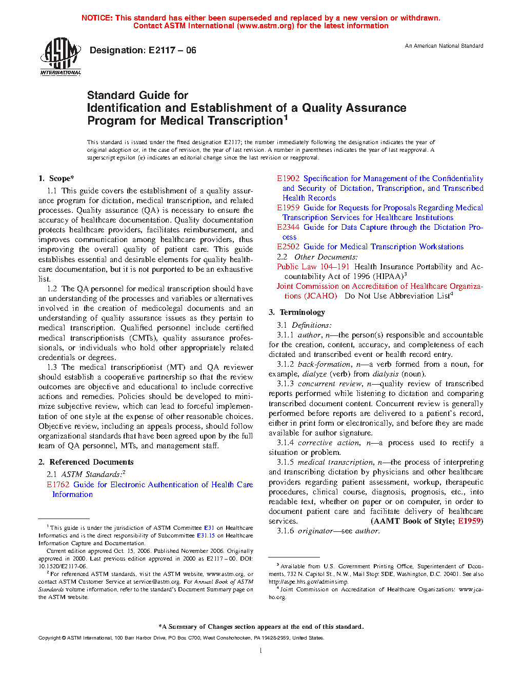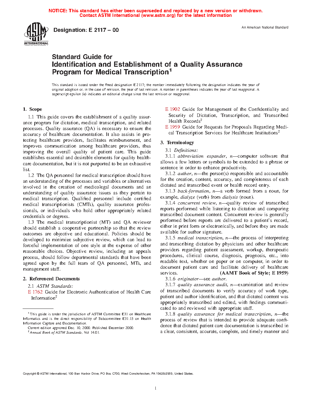1.1 This guide covers the establishment of a quality assurance program for dictation, medical transcription, and related processes. Quality assurance (QA) is necessary to ensure the accuracy of healthcare documentation. Quality documentation protects healthcare providers, facilitates reimbursement, and improves communication among healthcare providers, thus improving the overall quality of patient care. This guide establishes essential and desirable elements for quality healthcare documentation, but it is not purported to be an exhaustive list.