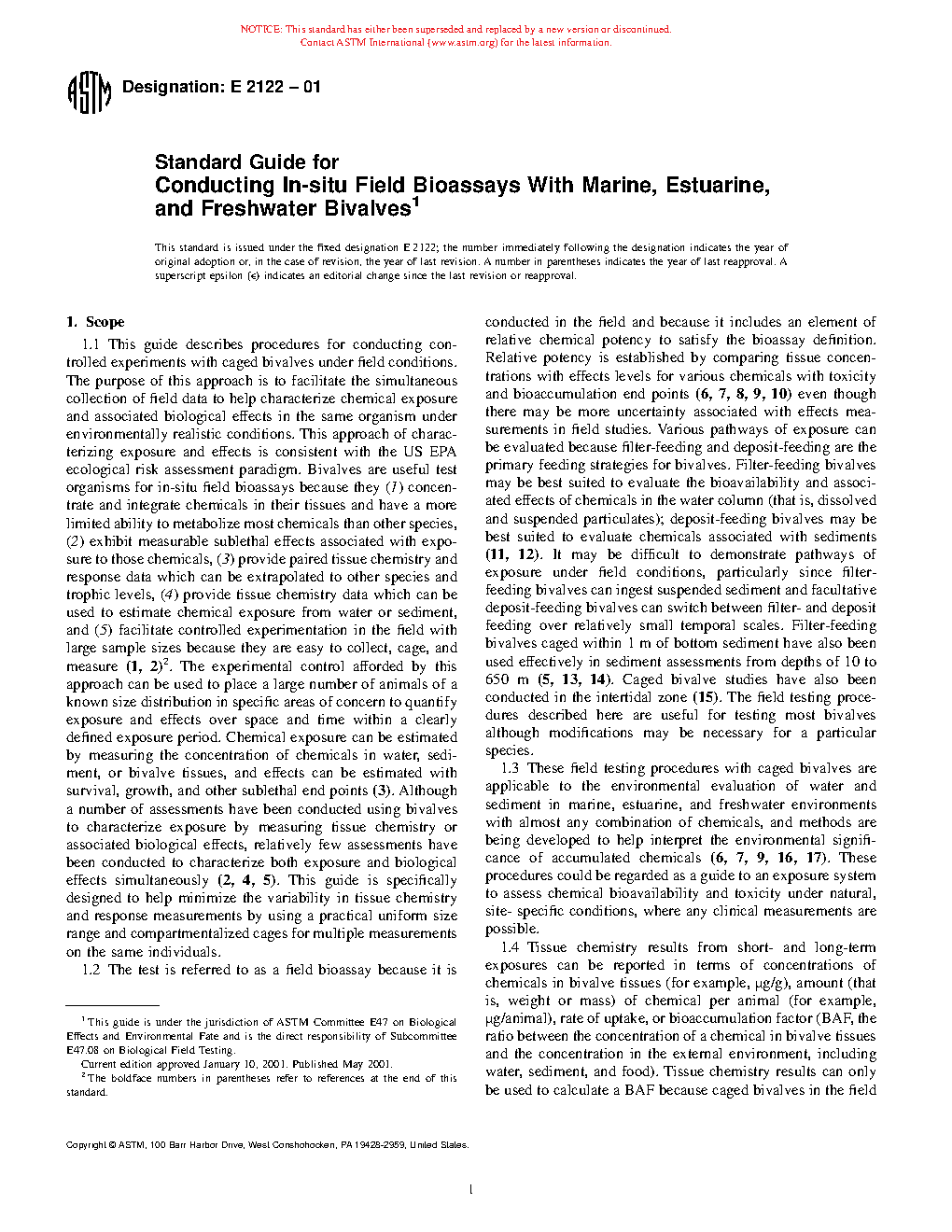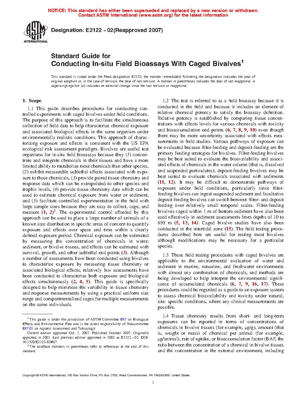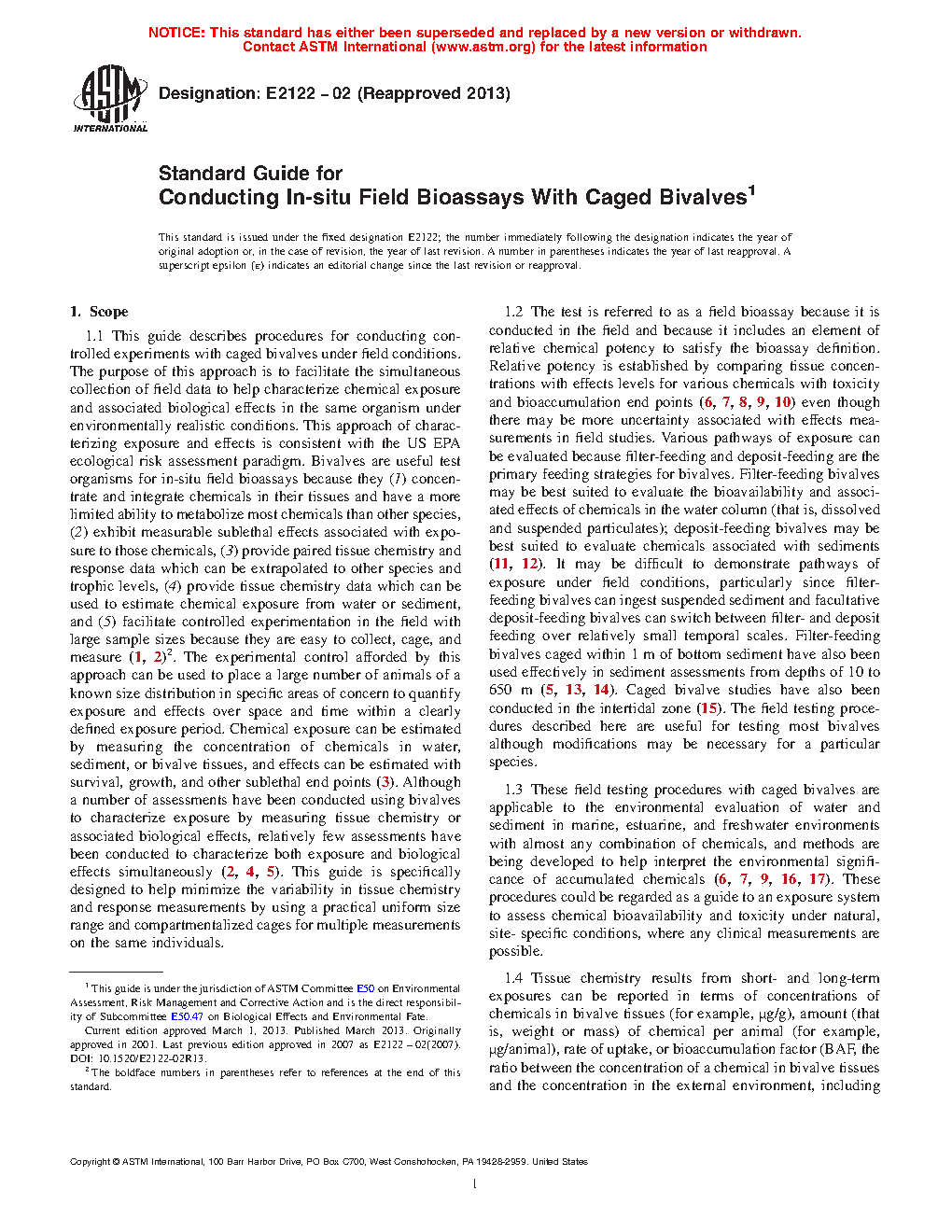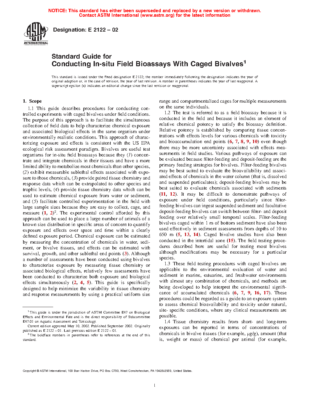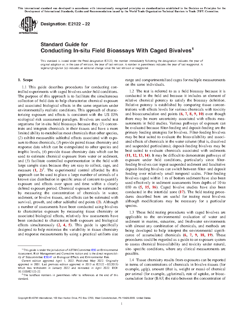 1.1 This guide describes procedures for conducting controlled experiments with caged bivalves under field conditions. The purpose of this approach is to facilitate the simultaneous collection of field data to help characterize chemical exposure and associated biological effects in the same organism under environmentally realistic conditions. This approach of characterizing exposure and effects is consistent with the US EPA ecological risk assessment paradigm. Bivalves are useful test organisms for in-situ field bioassays because they (1) concentrate and integrate chemicals in their tissues and have a more limited ability to metabolize most chemicals than other species, (2) exhibit measurable sublethal effects associated with exposure to those chemicals, ( 3) provide paired tissue chemistry and response data which can be extrapolated to other species and trophic levels, (4) provide tissue chemistry data which can be used to estimate chemical exposure from water or sediment, and (5) facilitate controlled experimentation in the field with large sample sizes because they are easy to collect, cage, and measure (1, 2). The experimental control afforded by this approach can be used to place a large number of animals of a known size distribution in specific areas of concern to quantify exposure and effects over space and time within a clearly defined exposure period. Chemical exposure can be estimated by measuring the concentration of chemicals in water, sediment, or bivalve tissues, and effects can be estimated with survival, growth, and other sublethal end points (3). Although a number of assessments have been conducted using bivalves to characterize exposure by measuring tissue chemistry or associated biological effects, relatively few assessments have been conducted to characterize both exposure and biological effects simultaneously (2, 4, 5). This guide is specifically designed to help minimize the variability in tissue chemistry and response measurements by using a practical uniform size range and compartmentalized cages for multiple measurements on the same individuals.