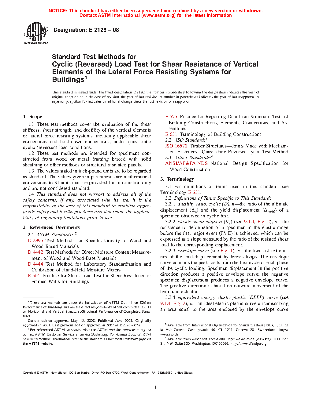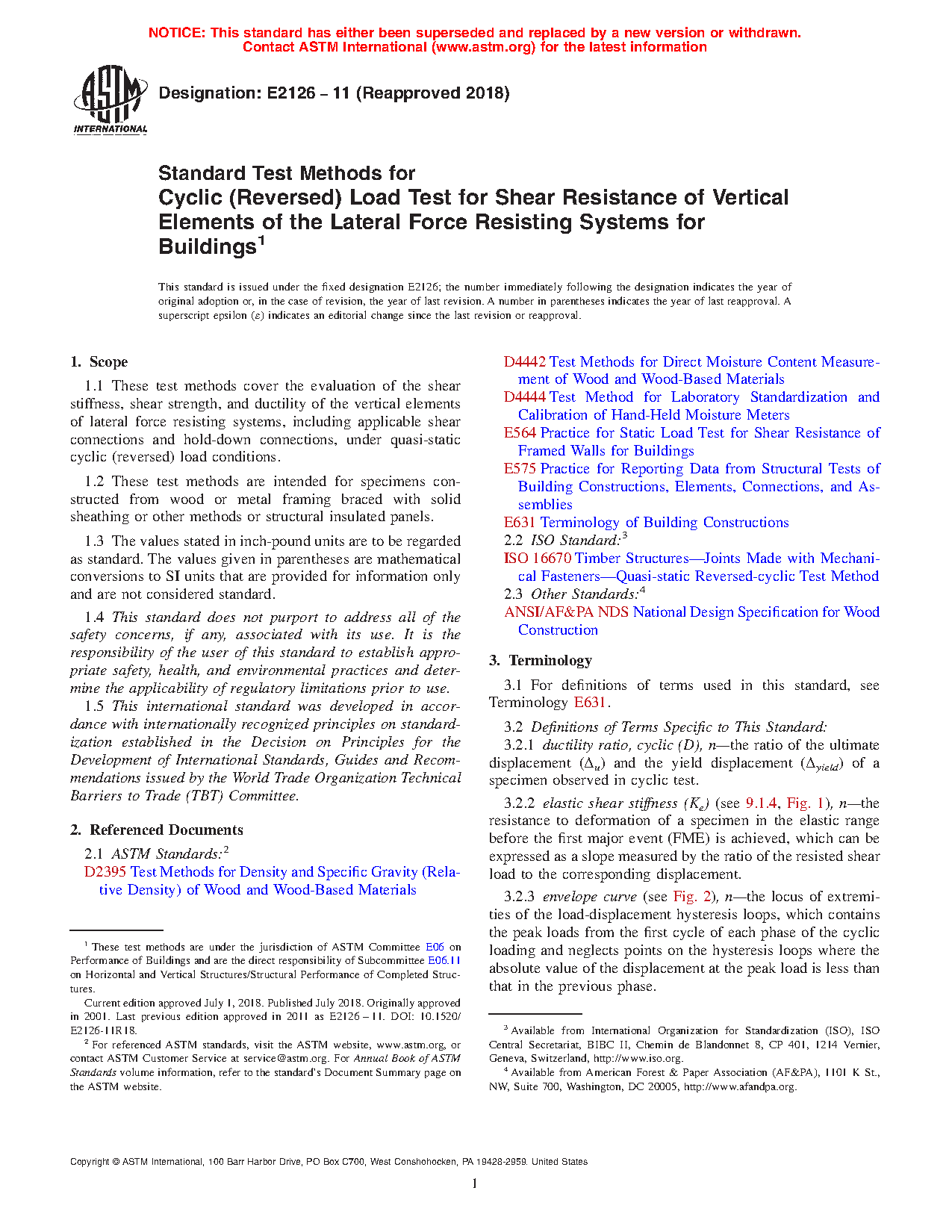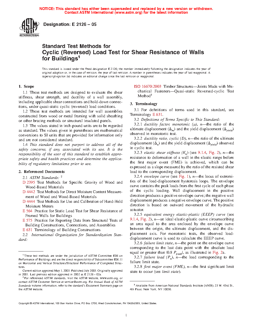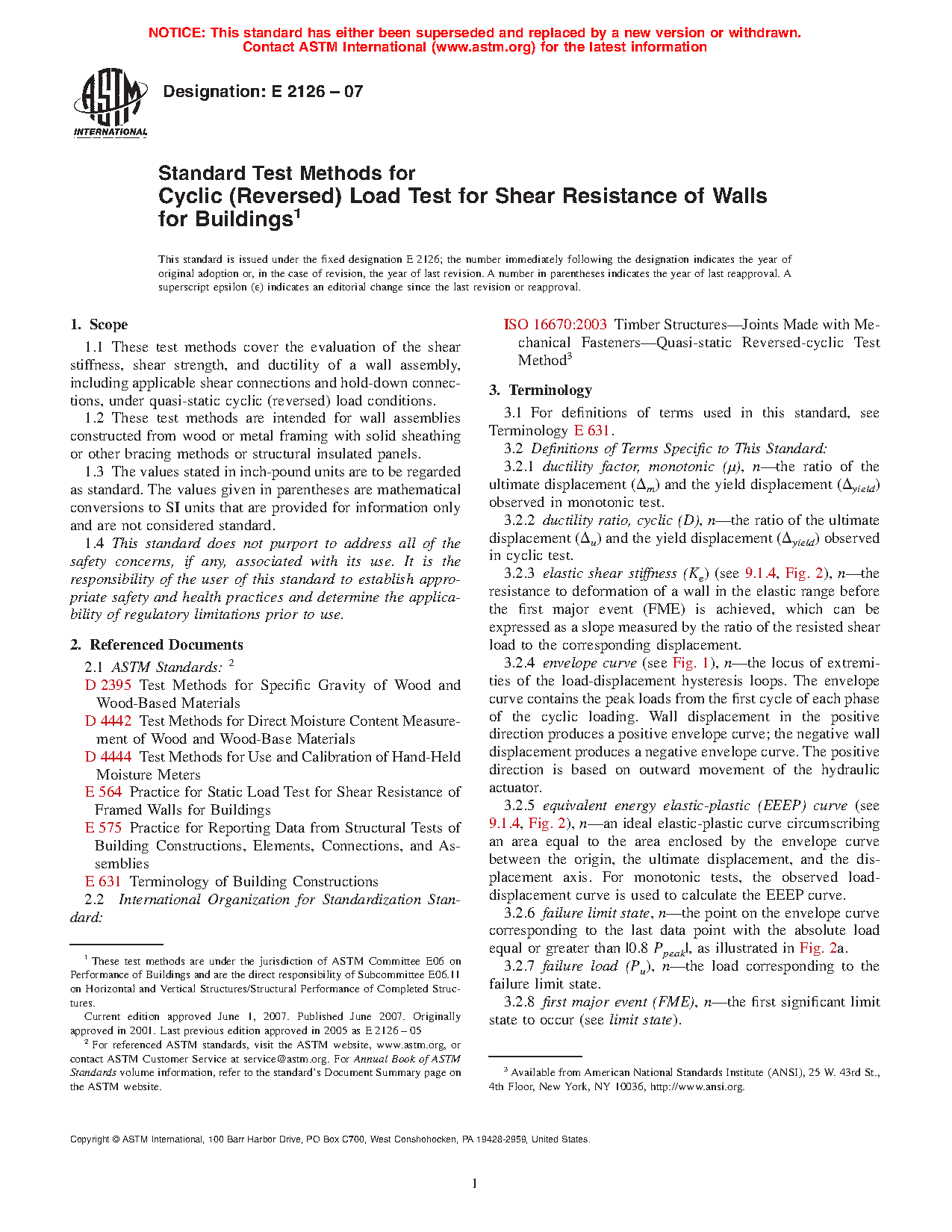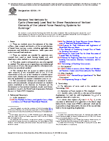 1.1 These test methods are designed to evaluate the shear stiffness, shear strength, and ductility of a wall assembly, including applicable shear connections and hold-down connections, under quasi-static cyclic (reversed) load conditions.