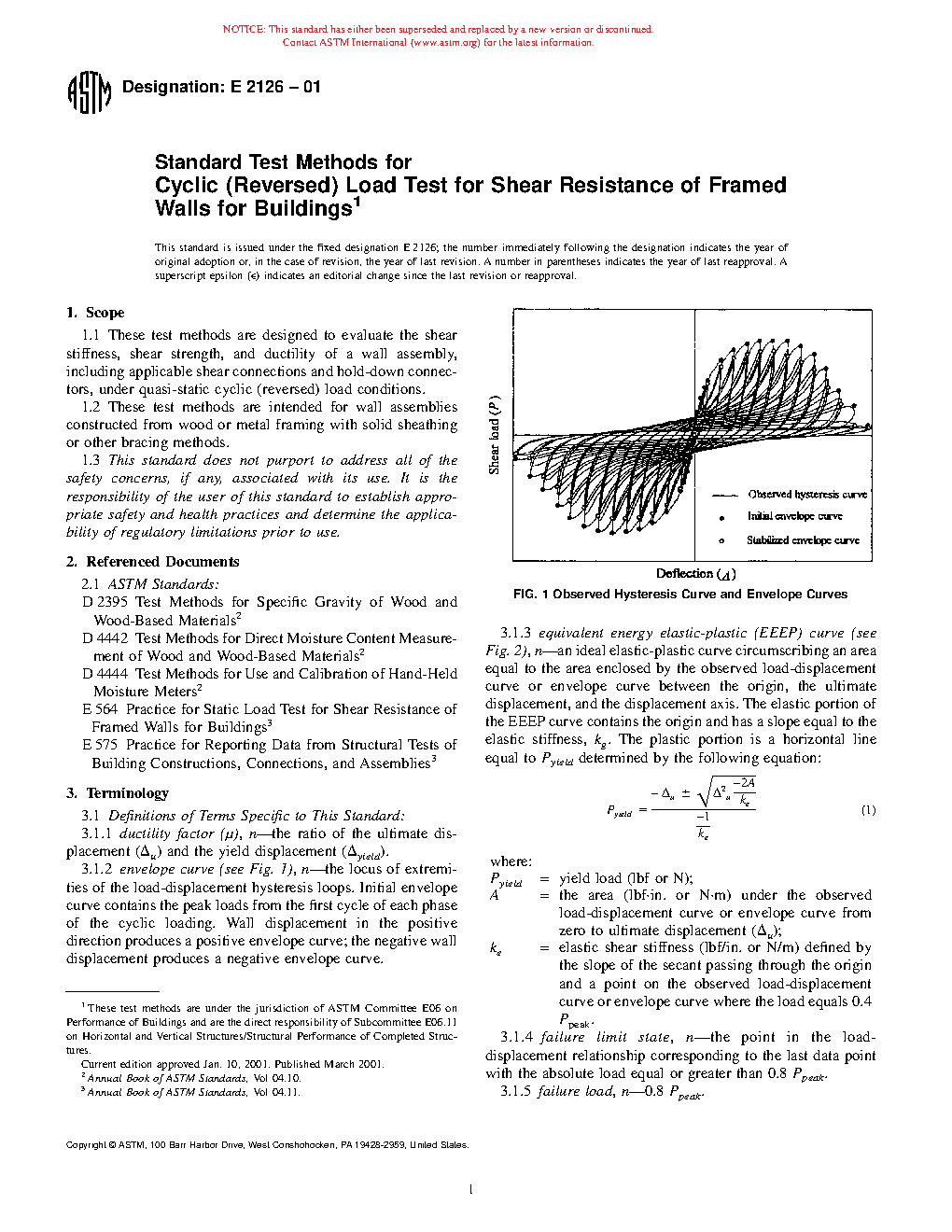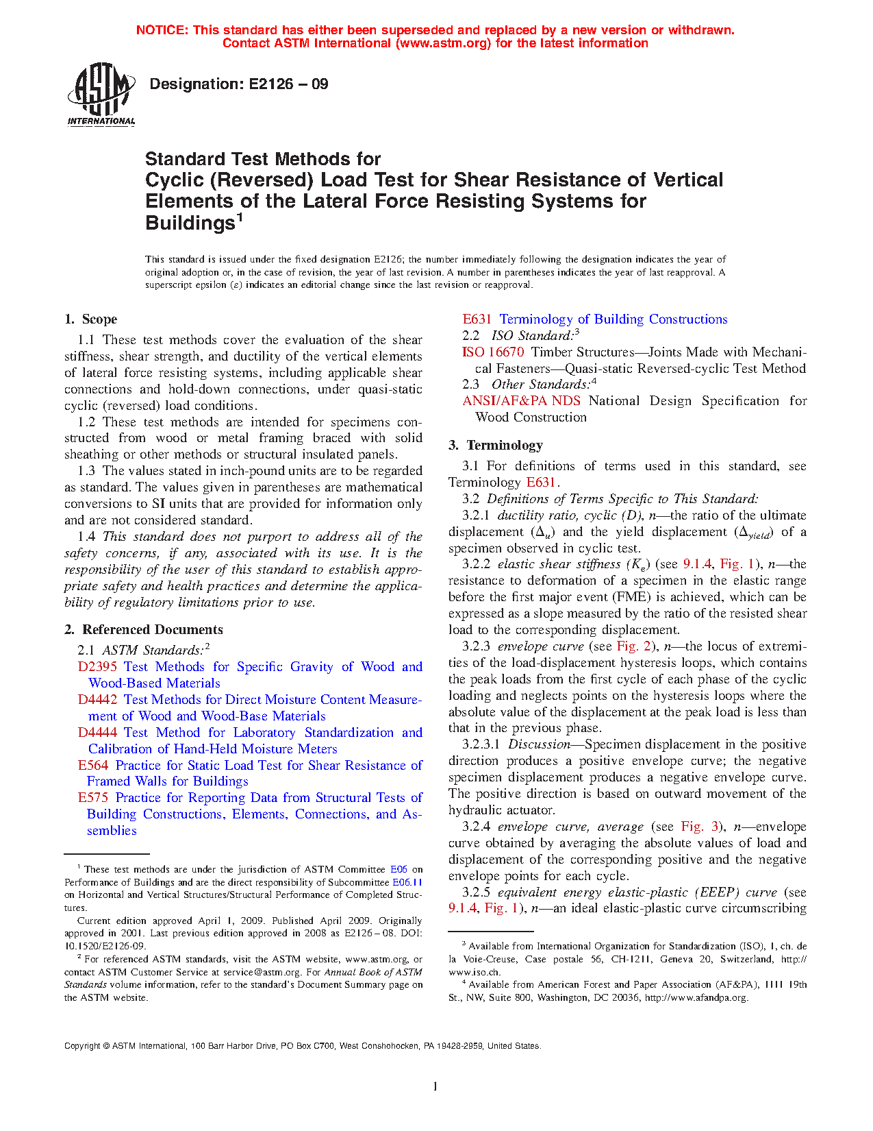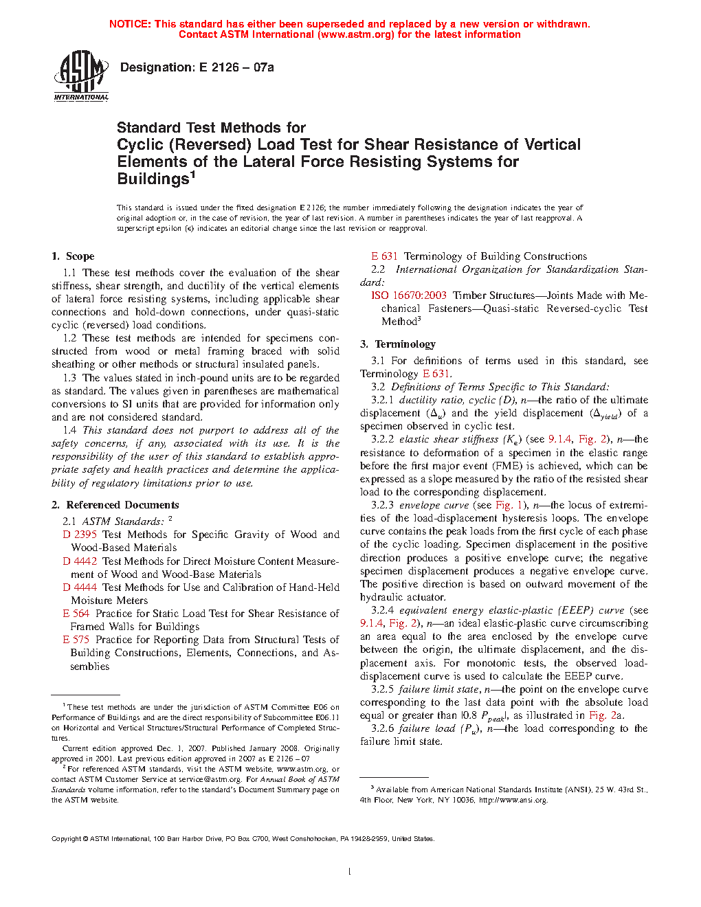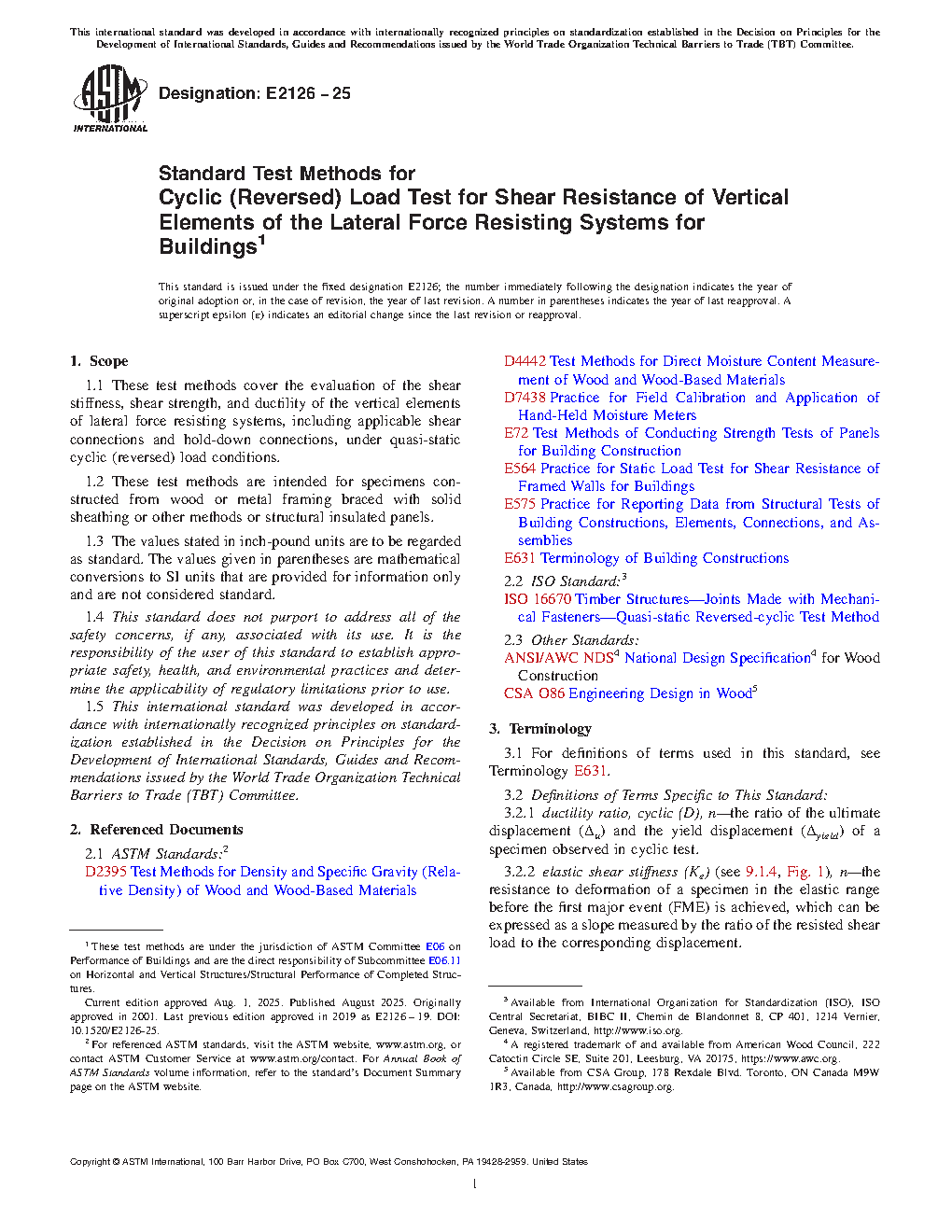 1.1 These test methods are designed to evaluate the shear stiffness, shear strength, and ductility of a wall assembly, including applicable shear connections and hold-down connections, under quasi-static cyclic (reversed) load conditions.