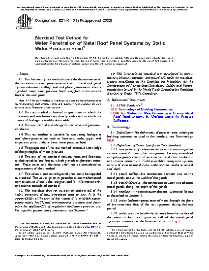 1.1 This laboratory test method covers the determination of the resistance to water penetration of exterior metal roof panel system sideseams, endlaps, and roof plane penetrations when a specified static water pressure head is applied to the outside face of the roof panel.