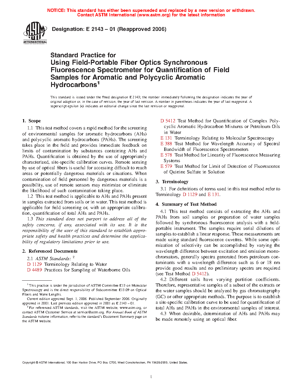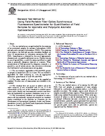 1.1 This test method covers a rapid method for the screening of environmental samples for aromatic hydrocarbons (AHs) and polycyclic aromatic hydrocarbons (PAHs). The screening takes place in the field and provides immediate feedback on limits of contamination by substances containing AHs and PAHs. Quantification is obtained by the use of appropriately characterized, site-specific calibration curves. Remote sensing by use of optical fibers is useful for accessing difficult to reach areas or potentially dangerous materials or situations. When contamination of field personnel by dangerous materials is a possibility, use of remote sensors may minimize or eliminate the likelihood of such contamination taking place.