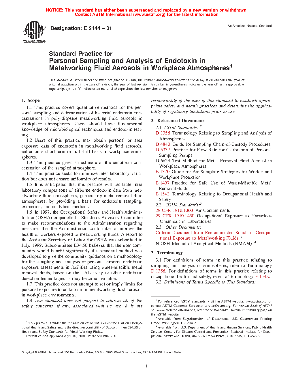1.7 This practice does not attempt to set or imply limits for personal exposure to endotoxin in metalworking fluid aerosols in workplace environments.