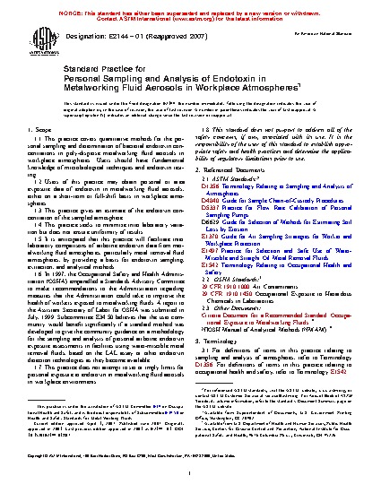 1.6 In 1997, the Occupational Safety and Health Administration (OSHA) empanelled a Standards Advisory Committee to make recommendations to the Administration regarding measures that the Administration could take to improve the health of workers exposed to metalworking fluids. A report to the Assistant Secretary of Labor for OSHA was submitted in July, 1999. Subcommittee E34.50 believes that the user community would benefit significantly if a standard method was developed to give the community guidance on a methodology for the sampling and analysis of personal airborne endotoxin exposure assessments in facilities using water-miscible metal removal fluids, based on the LAL assay or other endotoxin detection technologies as they become available.