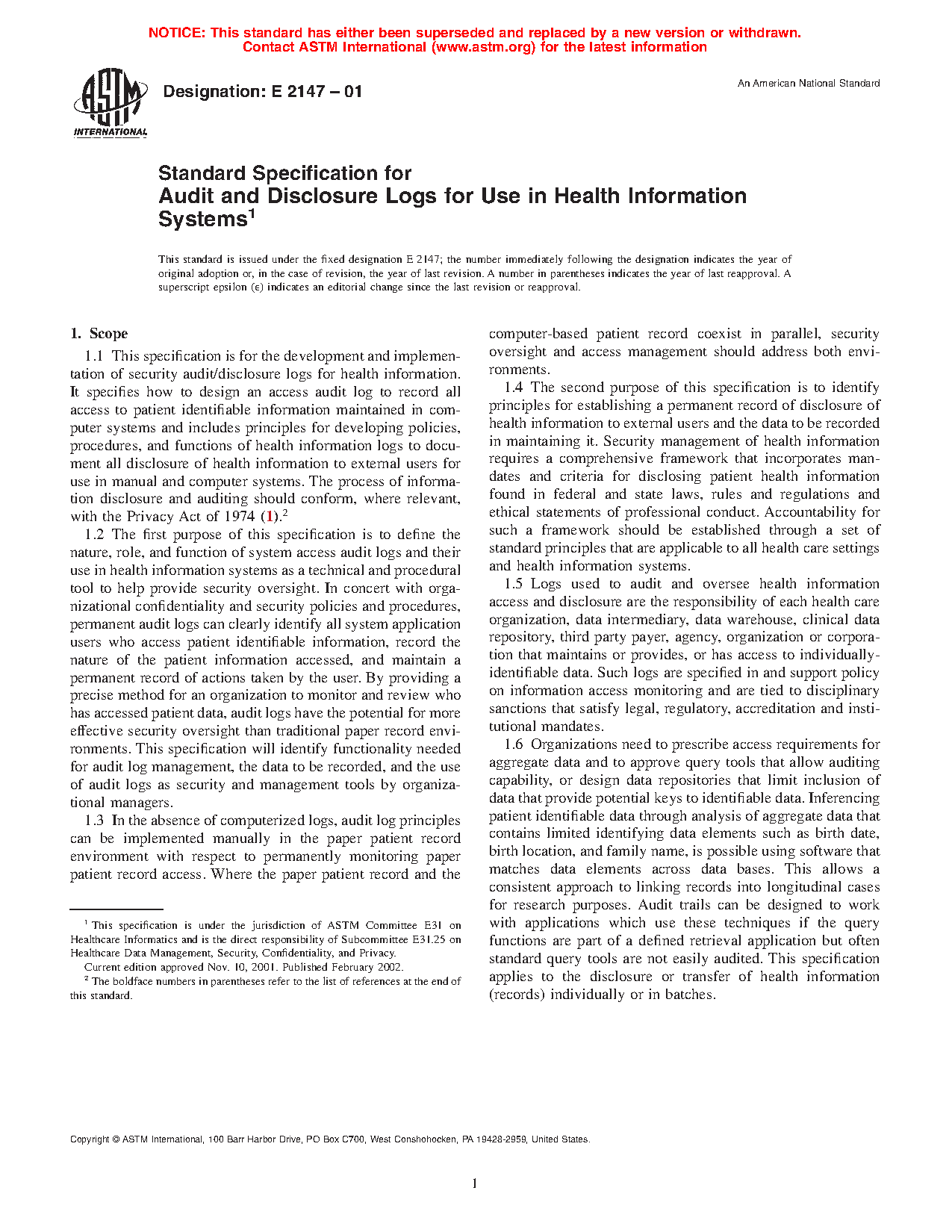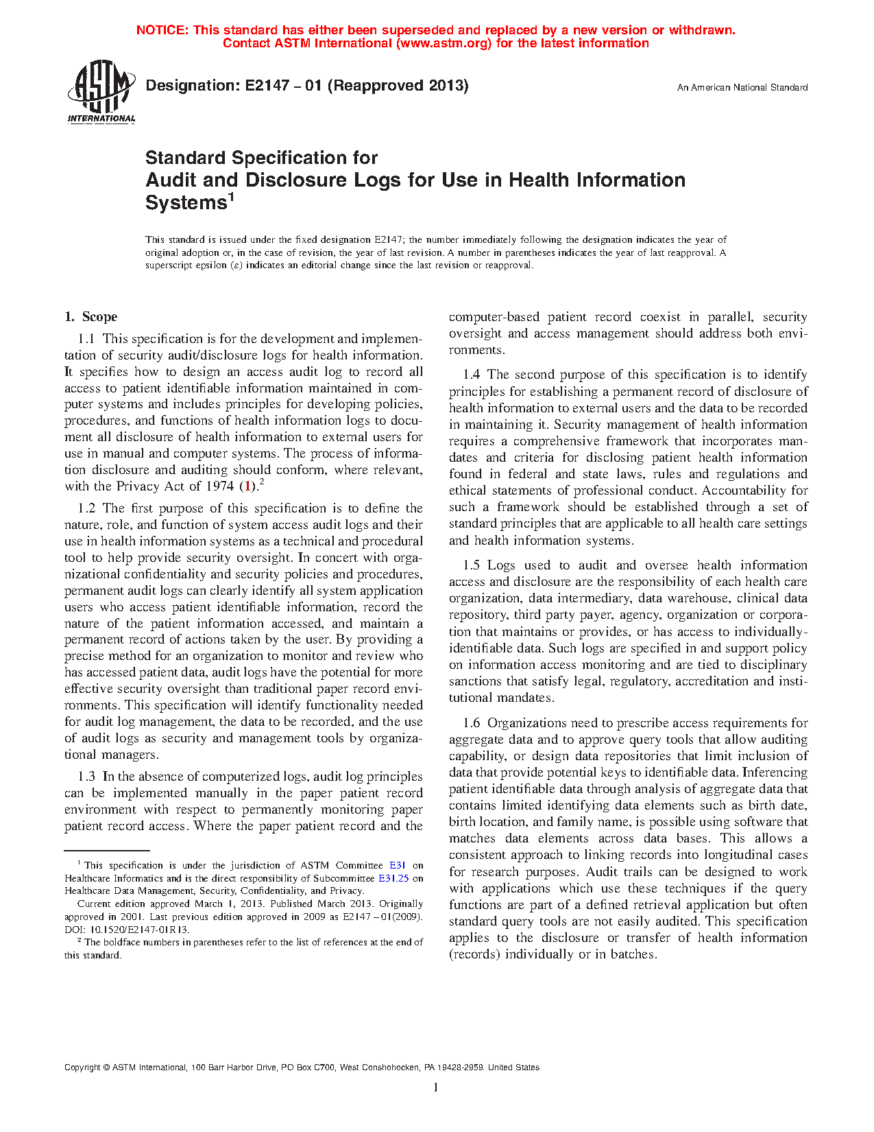 1.6 When non-patient-specific healthcare data is sought (for example, analyses of aggregate patient data for internal or external reviews, research, or subsidies), healthcare providers and organizations need to also prescribe access requirements for such aggregate data and approve query tools that allow complete auditing capability or design data repositories that, in an active query, can limit inclusion of data in end-product aggregate form that reveals potential keys to identifiable data. In other words, endproduct aggregate-patient data shall not contain patient-identifying data or elements that, through analysis, can be used to identify individuals through inferences. For example, fields such as birth date, sex, race, or relevant demographics, and medical records numbers, or combinations thereof, are analyzed together for research purposes, using software that matches data elements across databases, thereby allowing identification of specific patients through inferencing, while preserving patient privacy. Audit data and logs can be designed to work with such applications, if the query functions are part of a defined retrieval application, but the end-product data is safeguarded to protect patient identity from release. This specification applies to the disclosure or transfer of health information (records) whether as individual files or in batches.