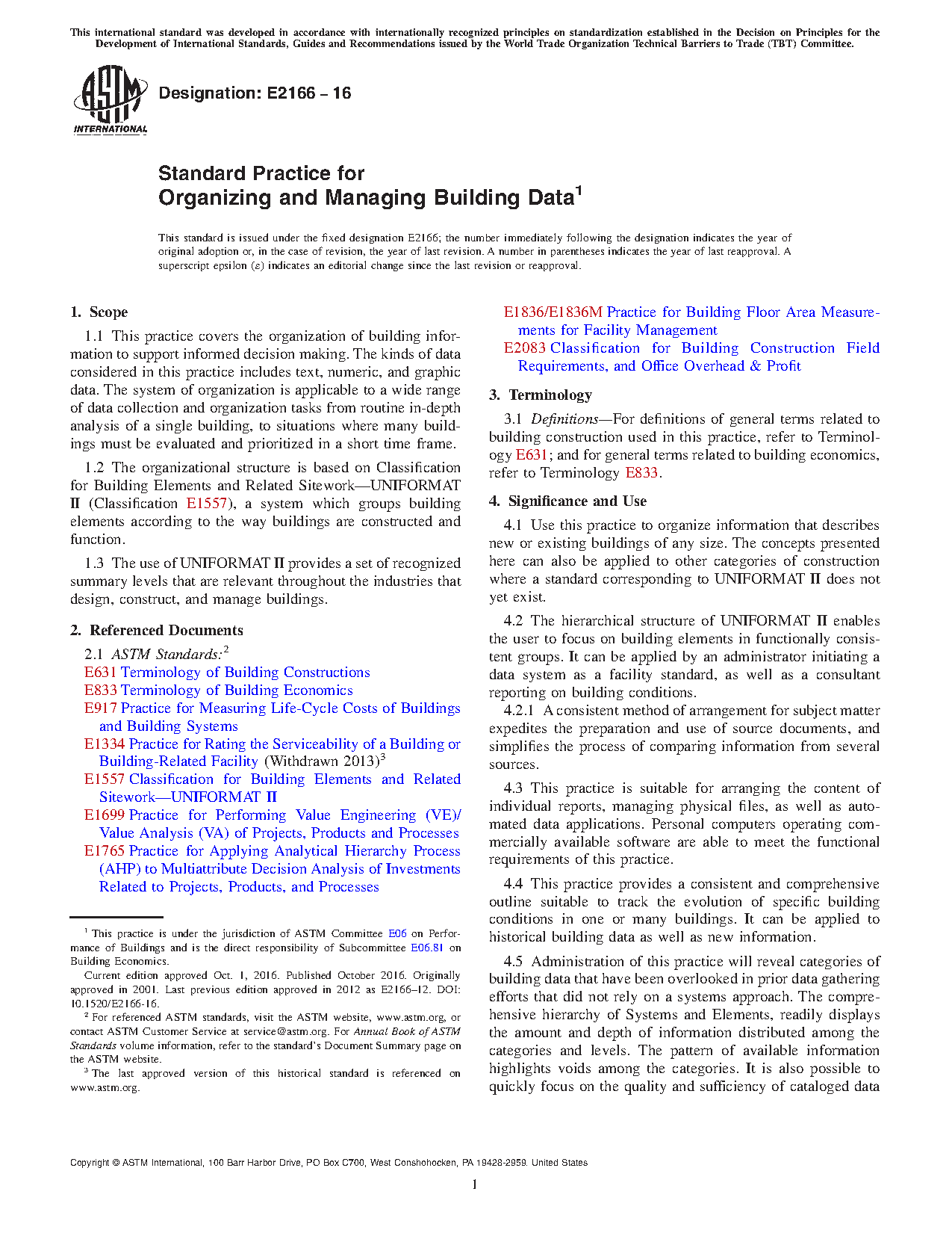 Use this practice to organize information that describes new or existing buildings of any size. The concepts presented here can also be applied to other categories of construction where a standard corresponding to UNIFORMAT II does not yet exist.