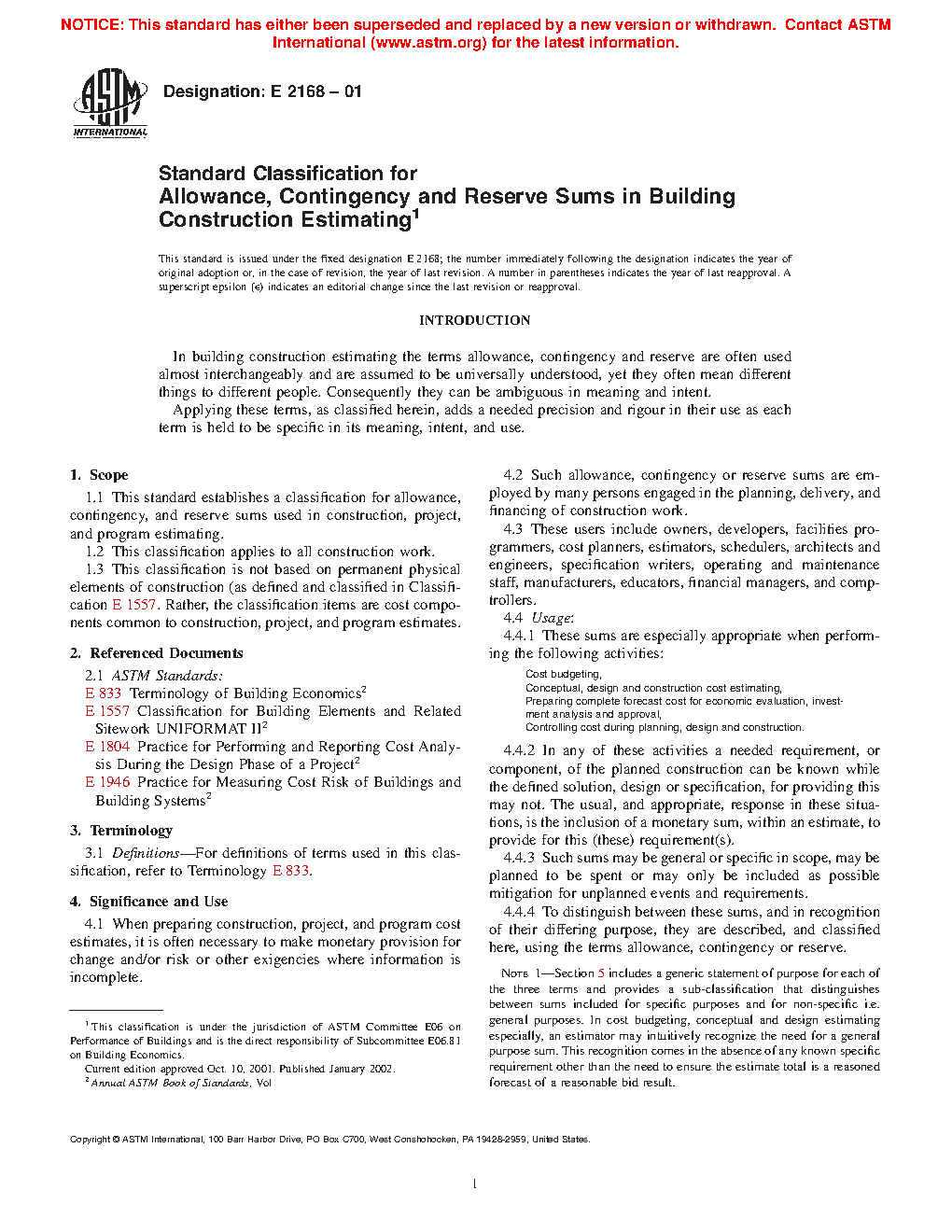 4.5 This classification defines allowance, contingency, and reserve sums as items common to construction, project, and program estimates through planning, design, construction, and completion. The terms are sufficiently generic to be applied in all forms of construction work.