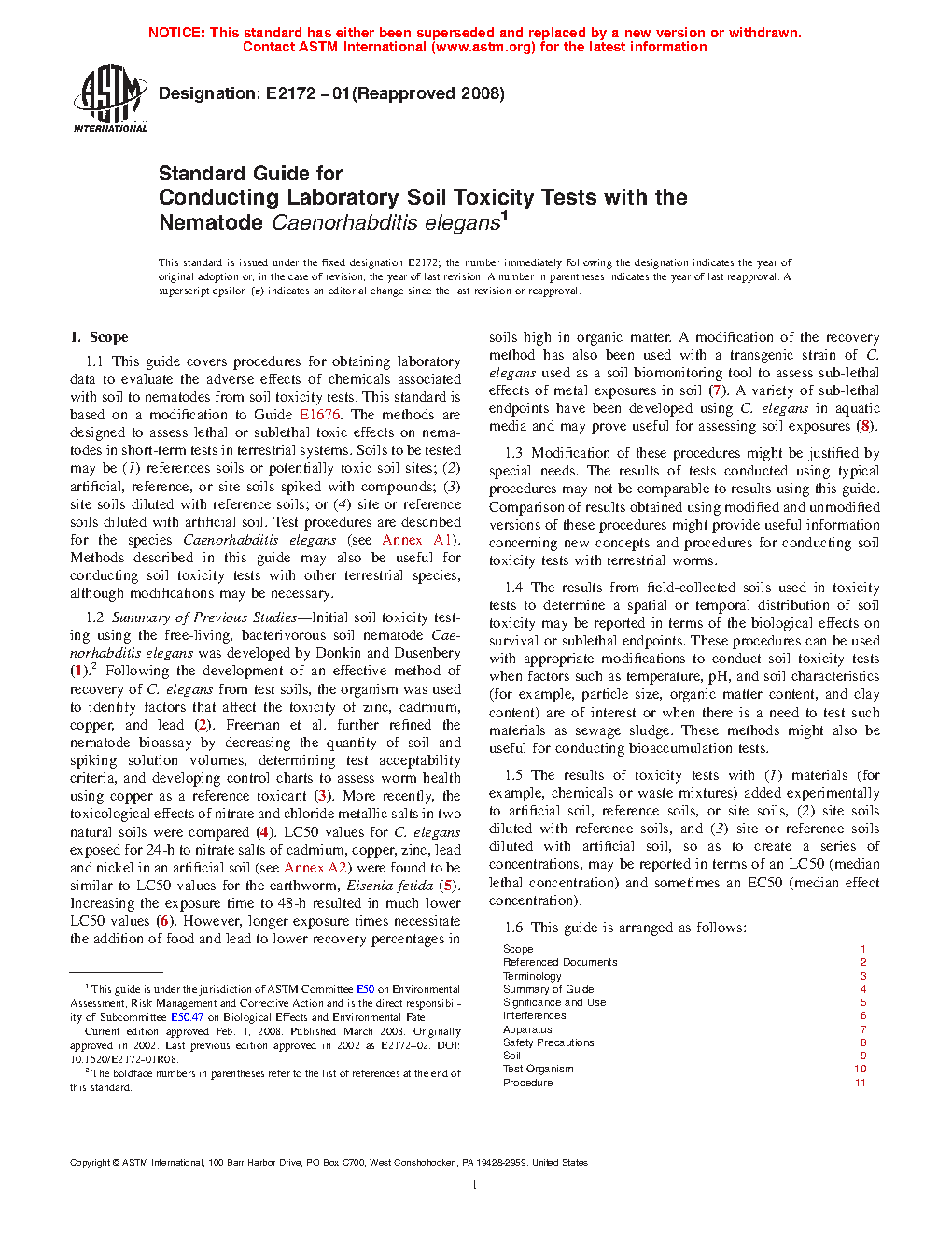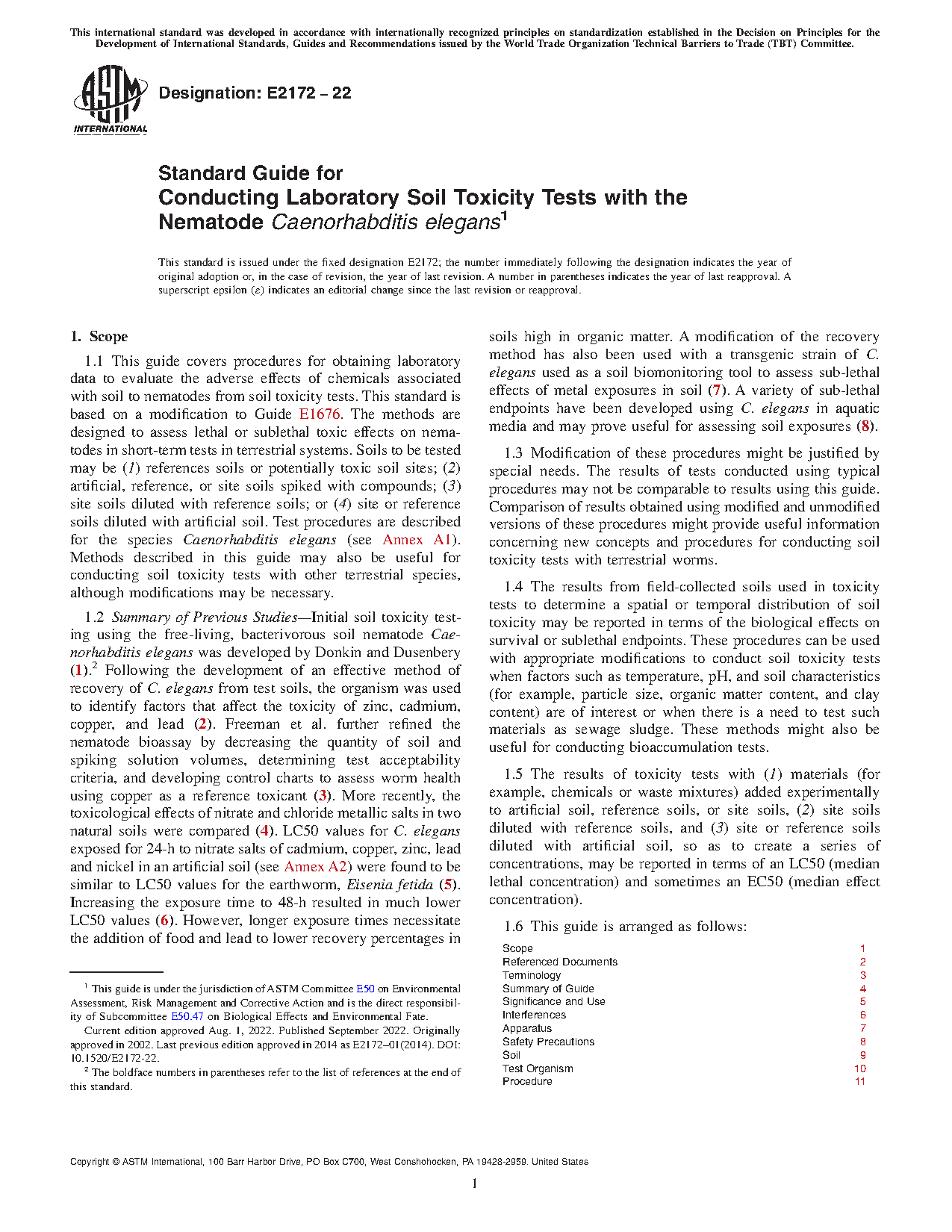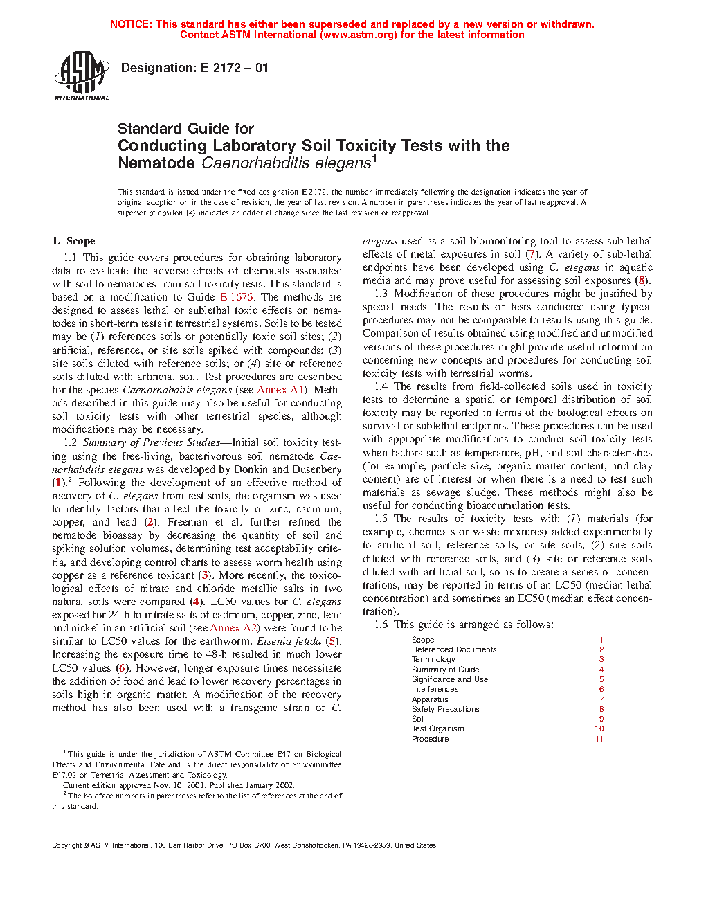 1.1 This guide covers procedures for obtaining laboratory data to evaluate the adverse effects of chemicals associated with soil to nematodes from soil toxicity tests. This standard is based on a modification to Guide E 1676. The methods are designed to assess lethal or sublethal toxic effects on nematodes in short-term tests in terrestrial systems. Soils to be tested may be (1) references soils or potentially toxic soil sites; (2) artificial, reference, or site soils spiked with compounds; ( 3) site soils diluted with reference soils; or ( 4) site or reference soils diluted with artificial soil. Test procedures are described for the species Caenorhabditis elegans (see Annex A1). Methods described in this guide may also be useful for conducting soil toxicity tests with other terrestrial species, although modifications may be necessary.